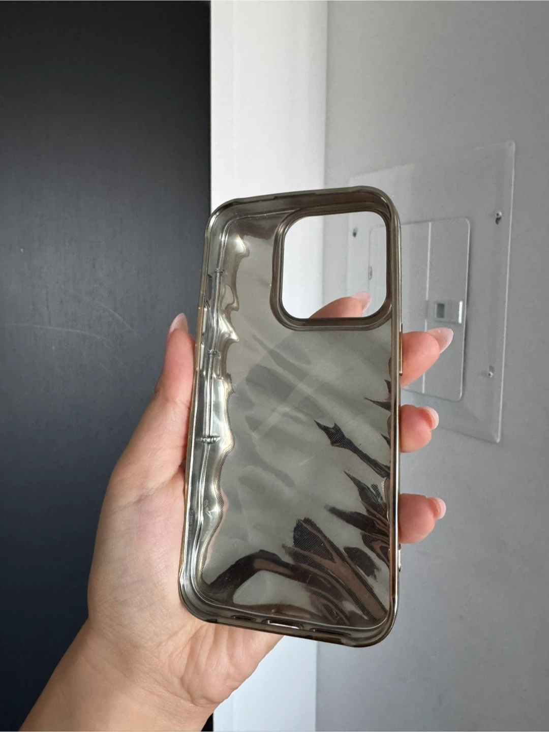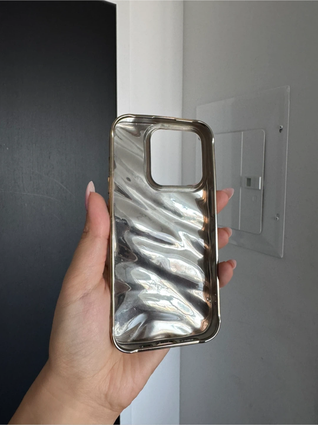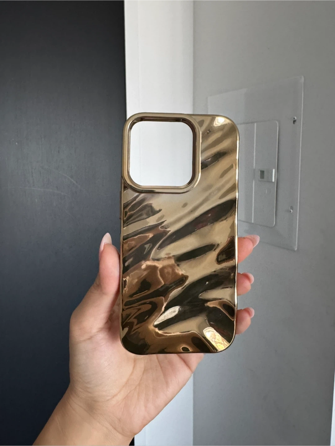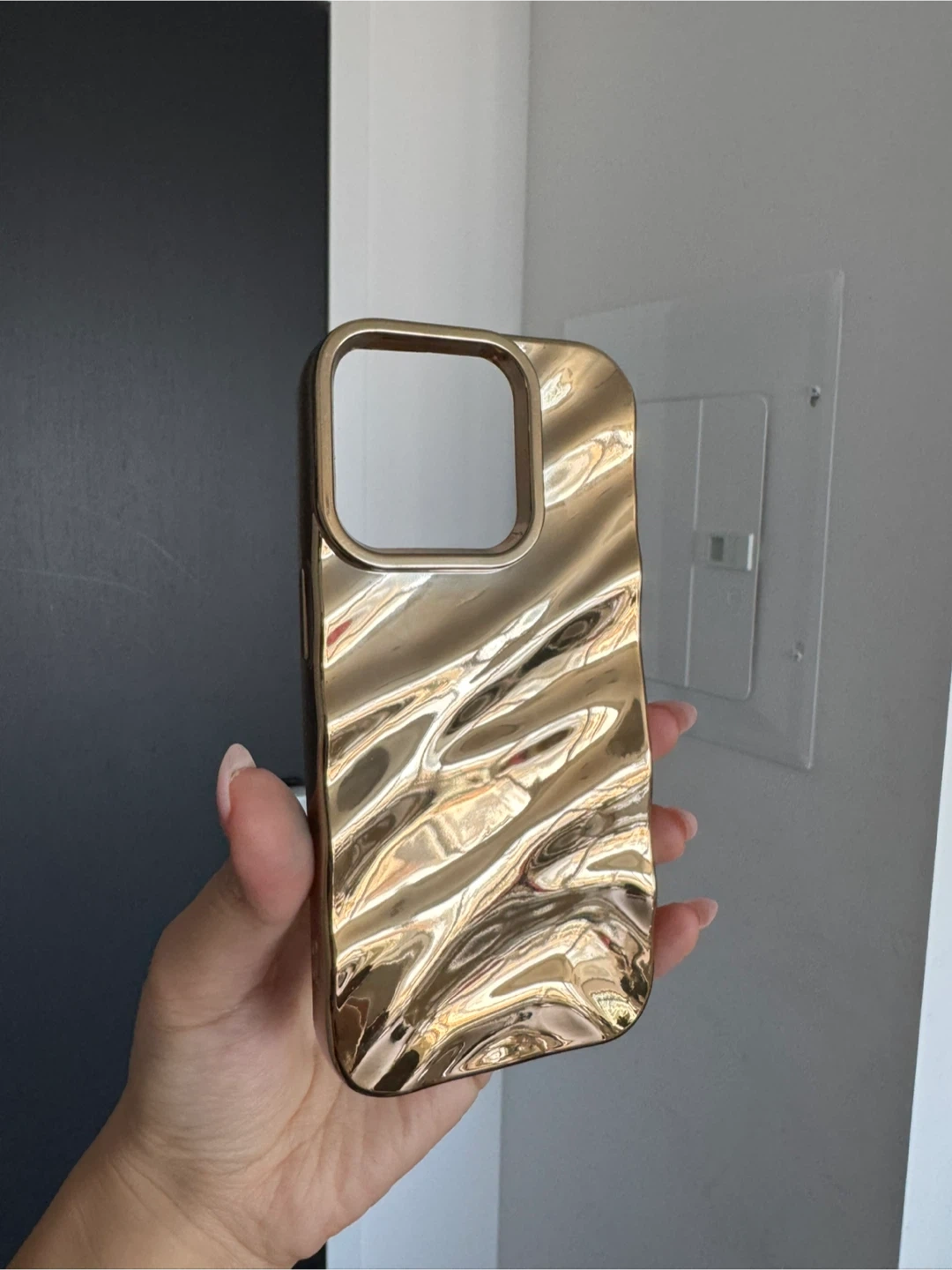 Selling a brand new iPhone 15 Pro case. It's a shiny gold colour with a cool, wavy texture. It's in great condition and ready for a new phone!