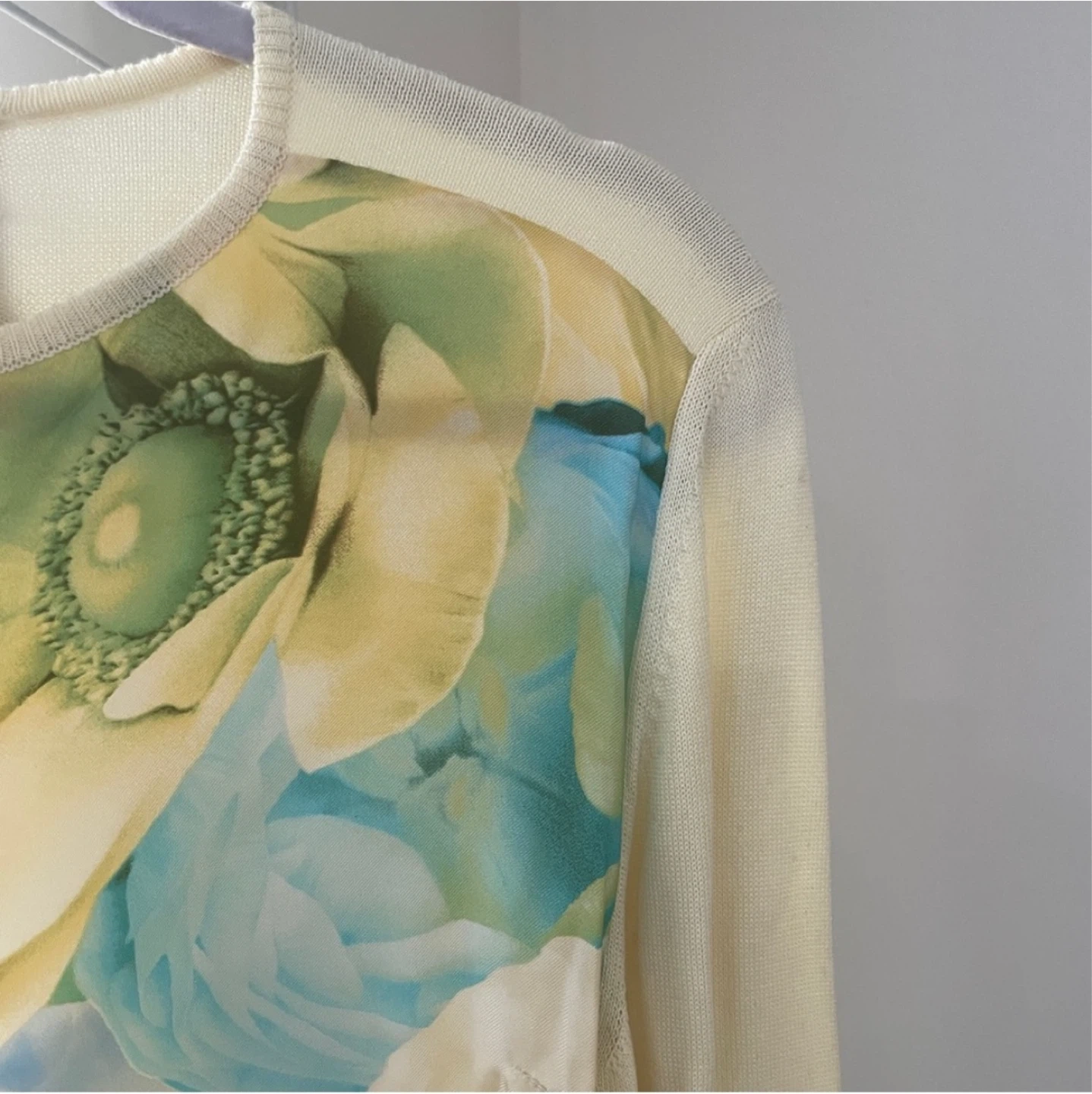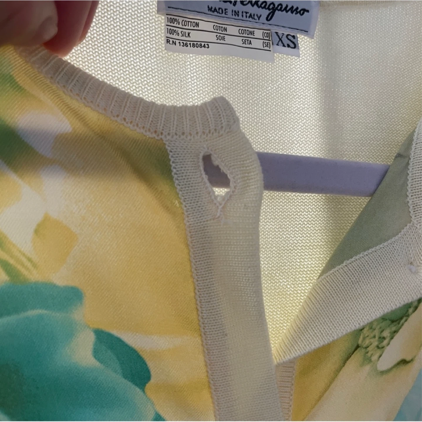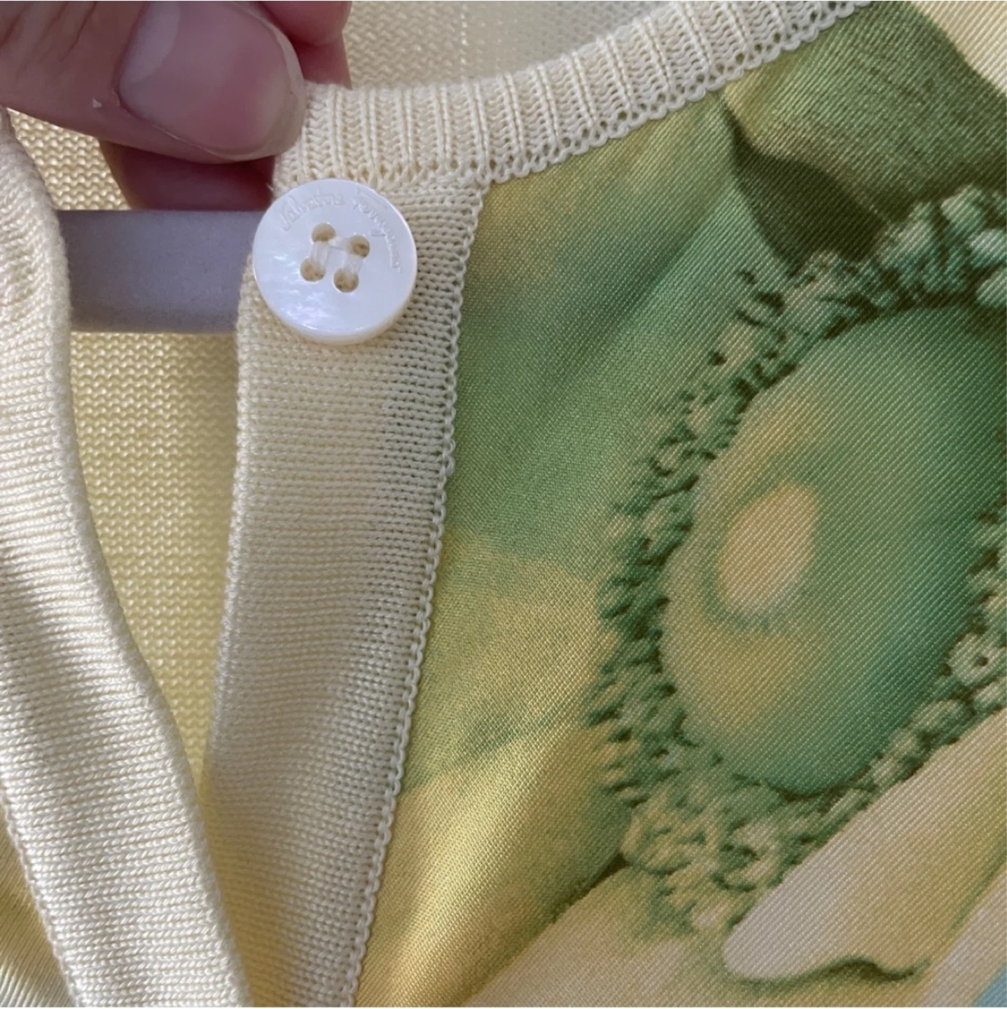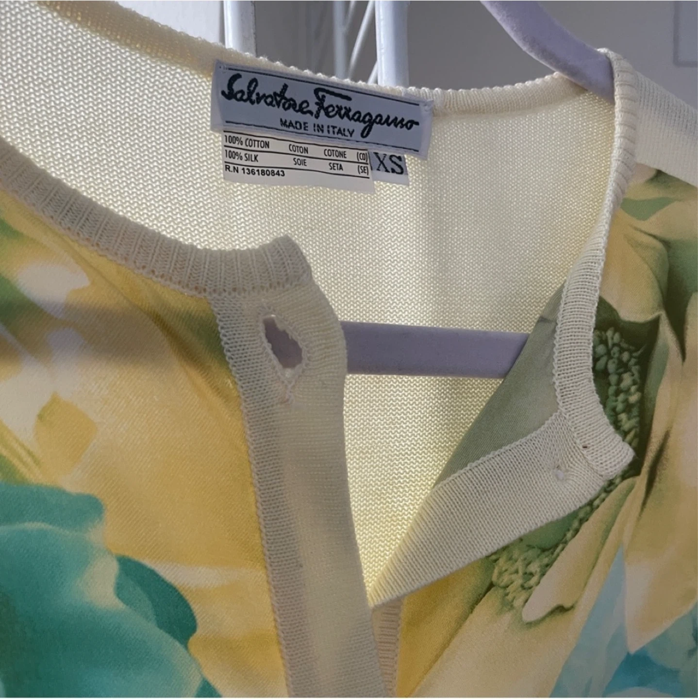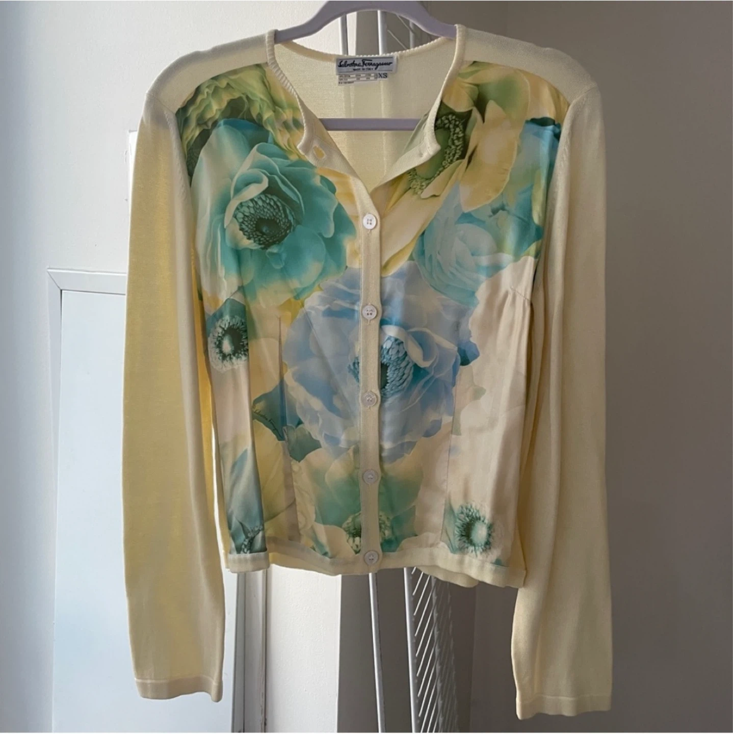 Authentic Ferragamo cardigan In excellent condition (button holes are a bit stretched out but not noticeable when buttoned up) • Made in Italy • Size: XS, relaxed fit • 100% cotton with 100% silk front panels with floral pattern • Professional dry cleaning only • Measurements: Length: 20" / 51cm Shoulder to shoulder: 17" / 43cm Sleeve length: 25" / 63.5cm Not accepting low ball offers