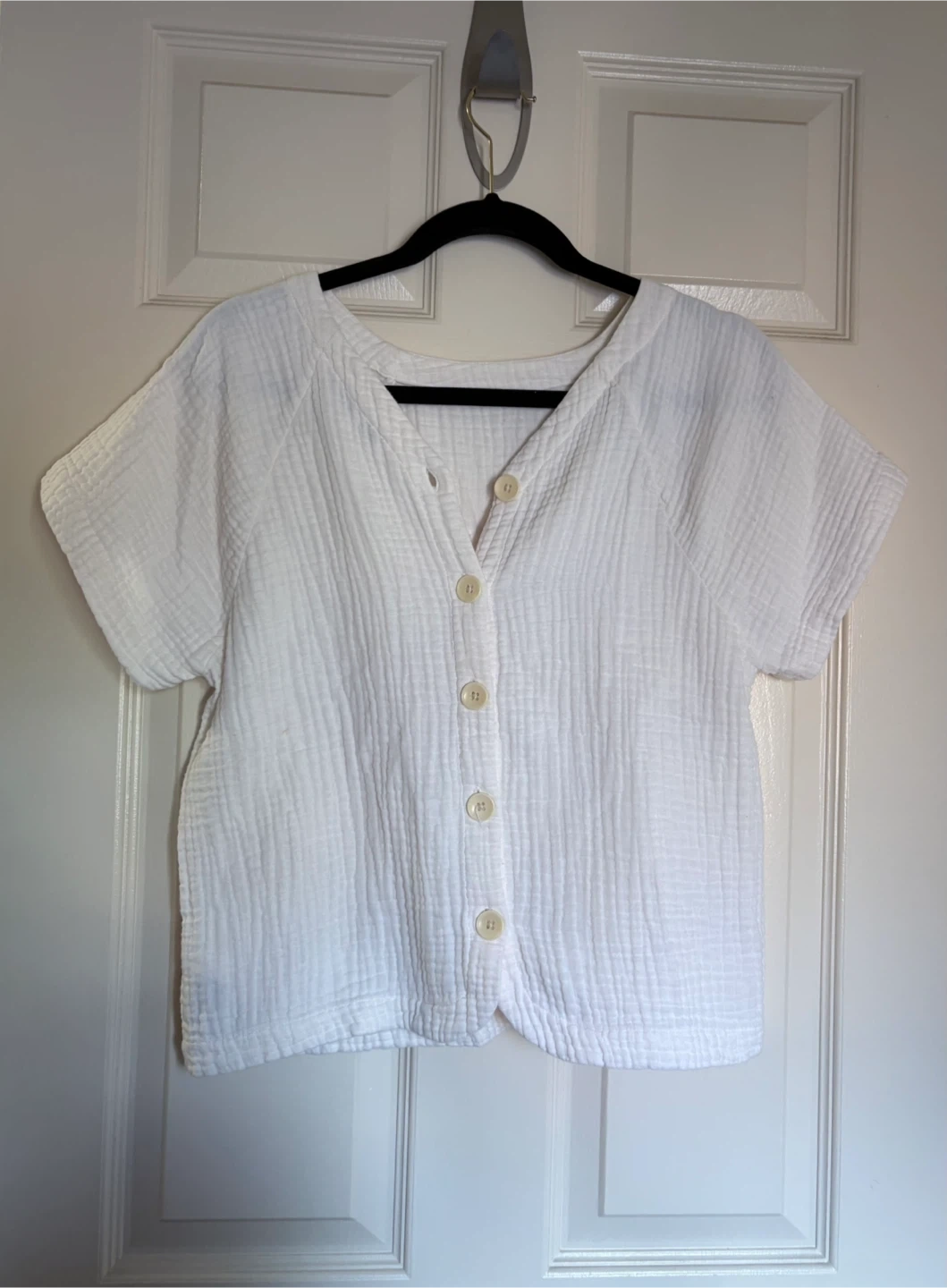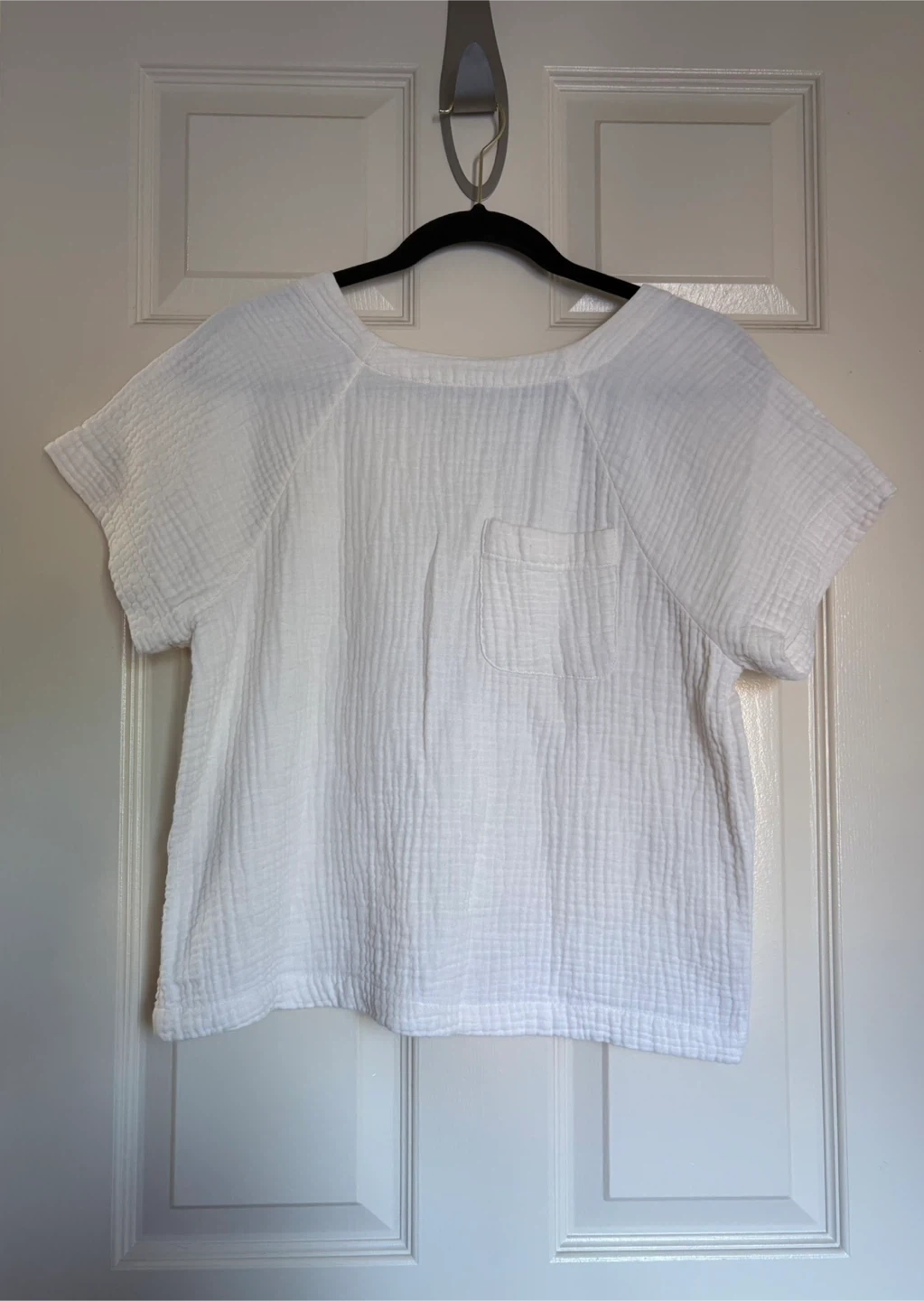 So cute on you. Madewell by J. Crew warm white top Size S PTP - 18” Length - 22” CALL OUT: there is a tiny mark on the back, barely seen and does not affect the functionality of the style Pocket in the front and cute v-back with button down! Cash preferred or etransfer Porch pick locations: Markham - Markham Rd & 16th Ave Oshawa - Wilson Rd & Adelaide Ave Pls feel free to ask me any questions