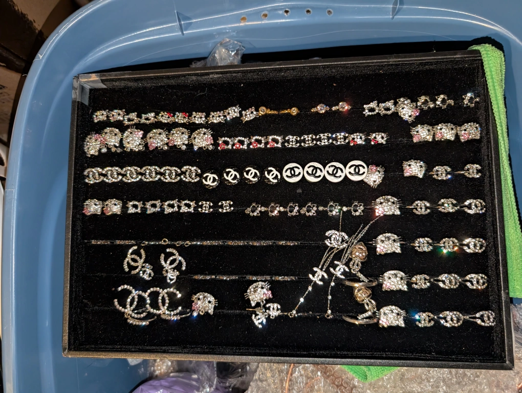 A selection of Chanel-inspired costume jewellery pieces. Includes earrings, bracelets, and necklaces. Perfect for adding a touch of sparkle to any outfit! price is for all address: Unionville