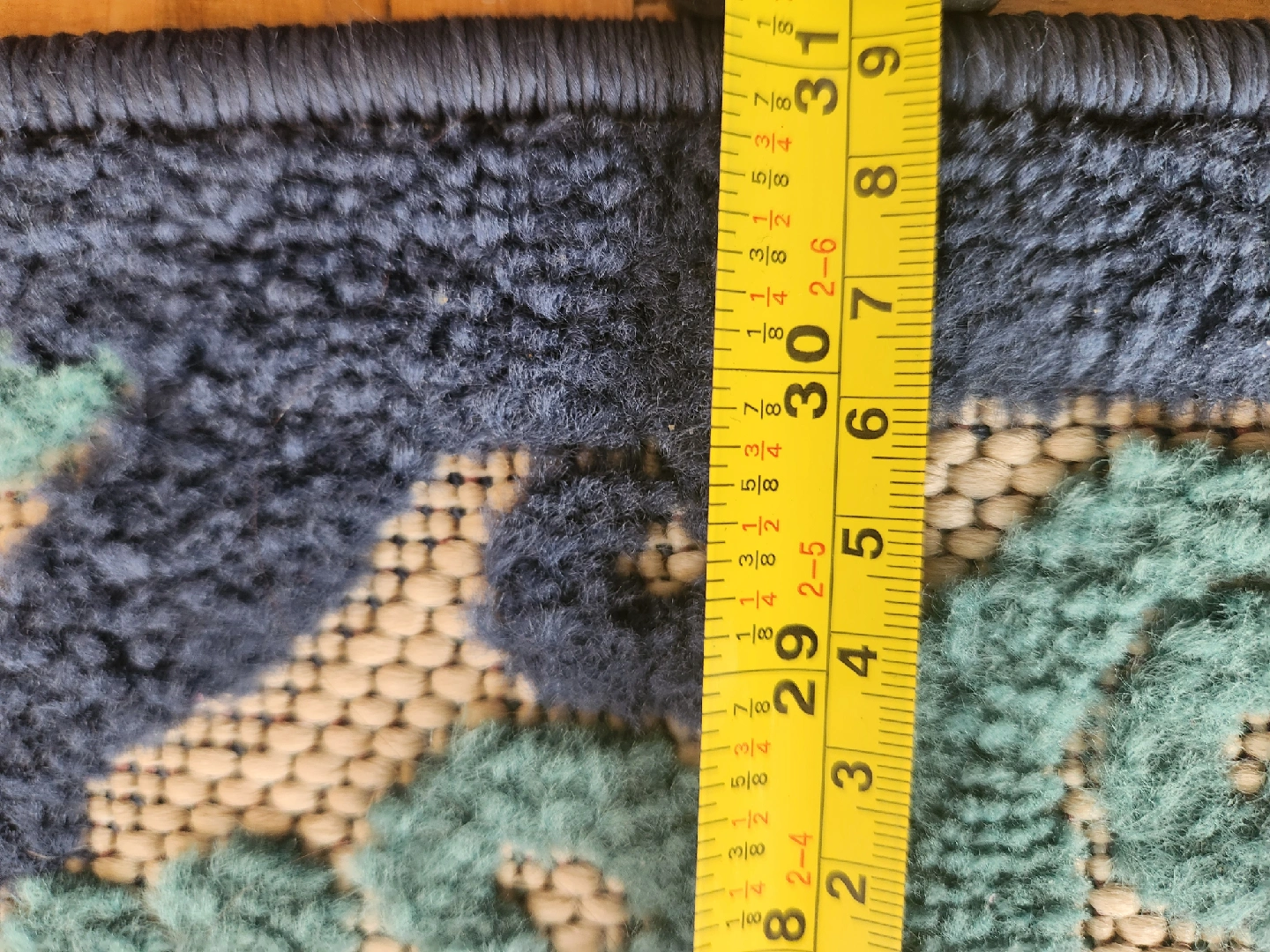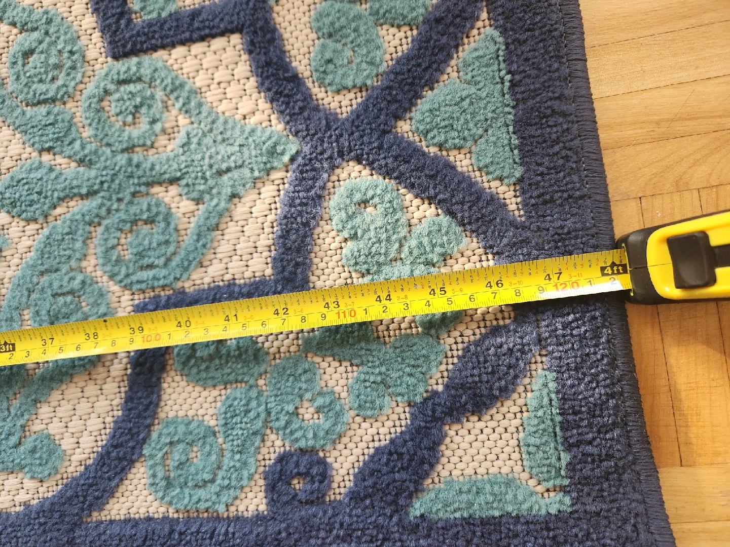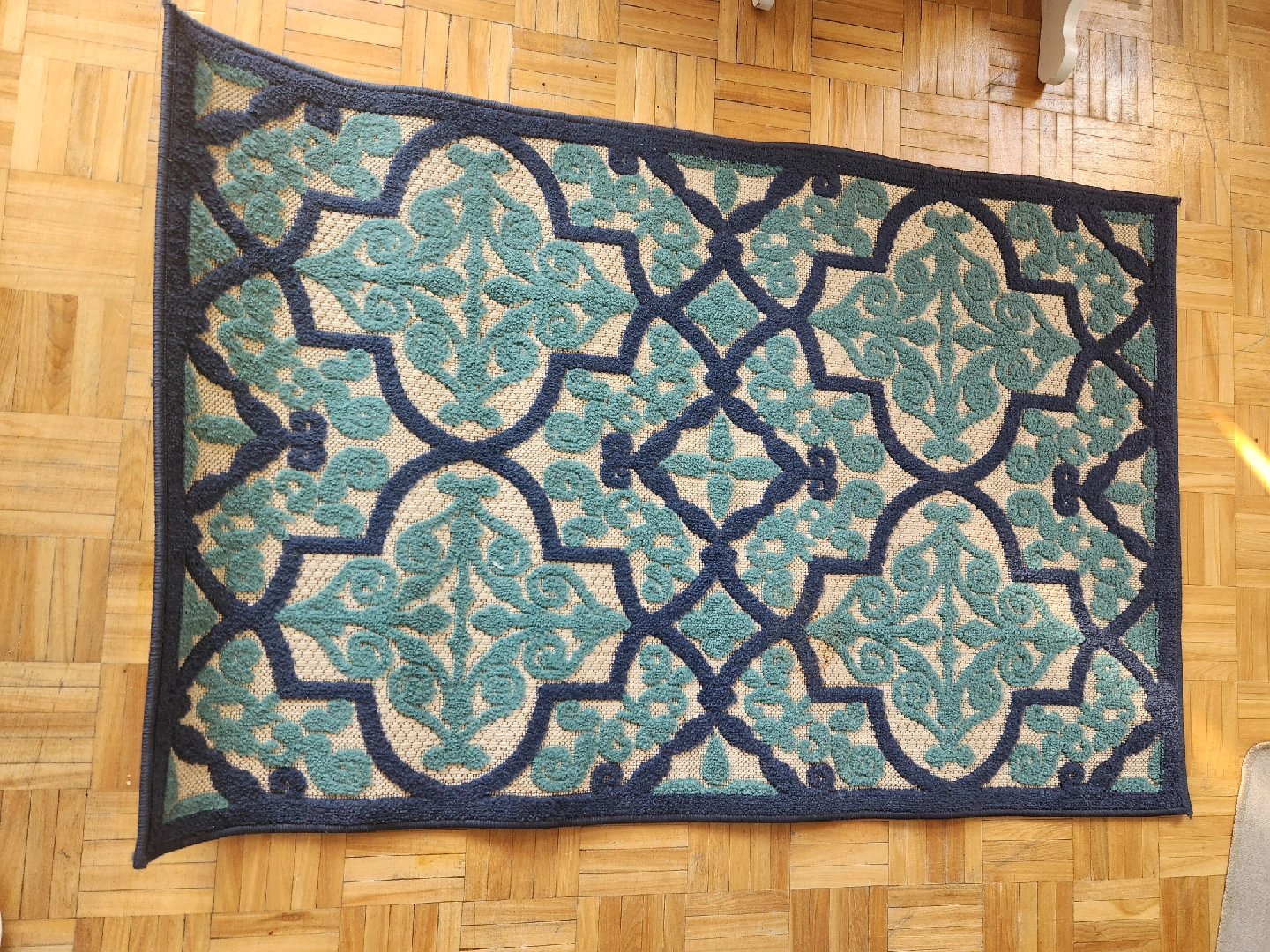 A lovely area rug featuring a blue and teal pattern. It measures approximately 4 feet by 9 feet, perfect for adding a touch of style to any room!
