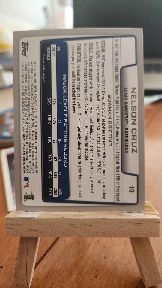 2012 Bowman Nelson Cruz Refractor (#10) – Texas Rangers Outfielder. Sharp card with nice shine, great for Cruz fans or refractor collectors. ✔ Official Topps/Bowman card ✔ Refractor parallel (see photos for shine) ✔ Good condition – kept stored safely Pickup: West Hamikton Mountain near Mohawk Rd and Rice Ave