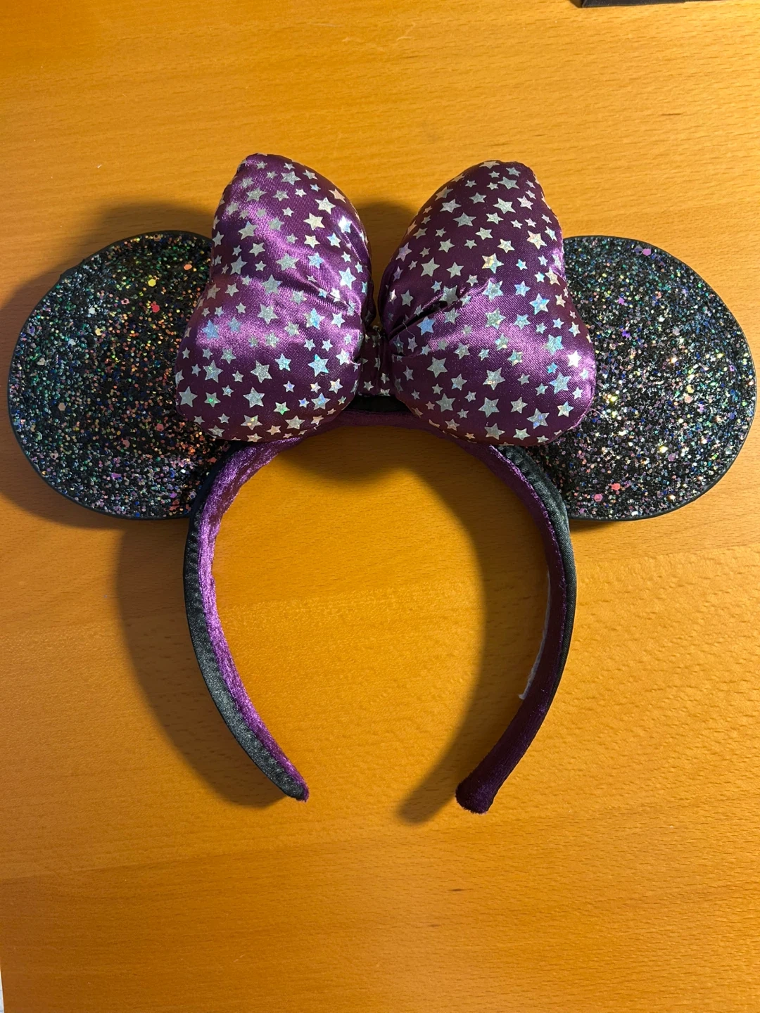 Cute Minnie Mouse ears with a purple star pattern on the bow and sparkly purple/black ears! Tag cut off