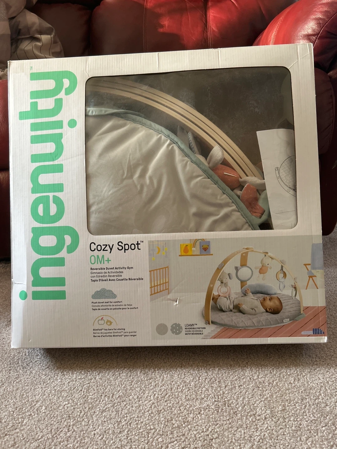 Selling an Ingenuity Cozy Spot Reversible Duvet Activity Gym for babies 0 months and up! It comes with SlimFold toy bars for easy storage and a plush duvet mat for comfort. The pattern is LOAMY™ and reversible