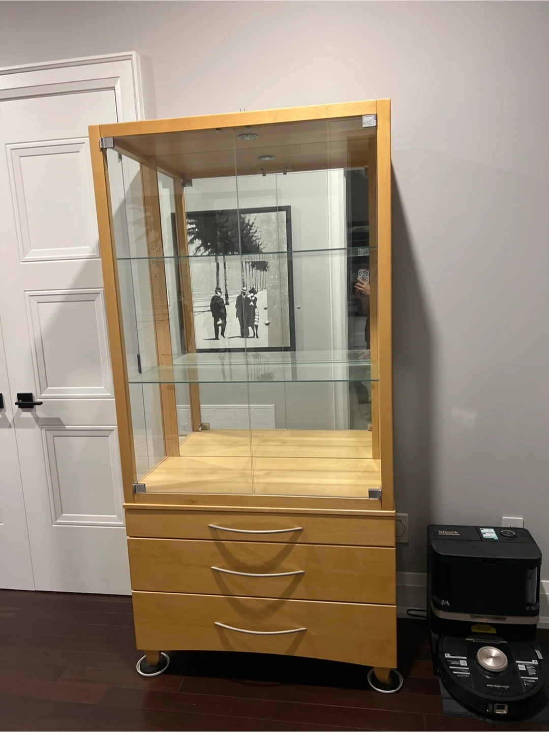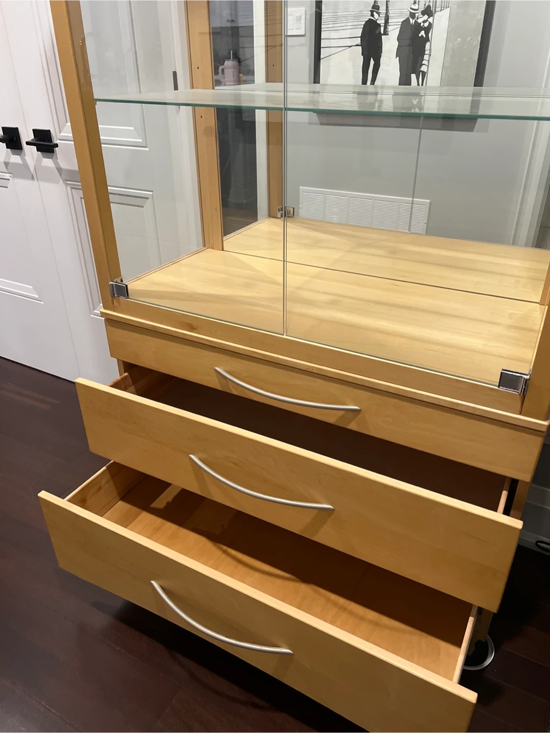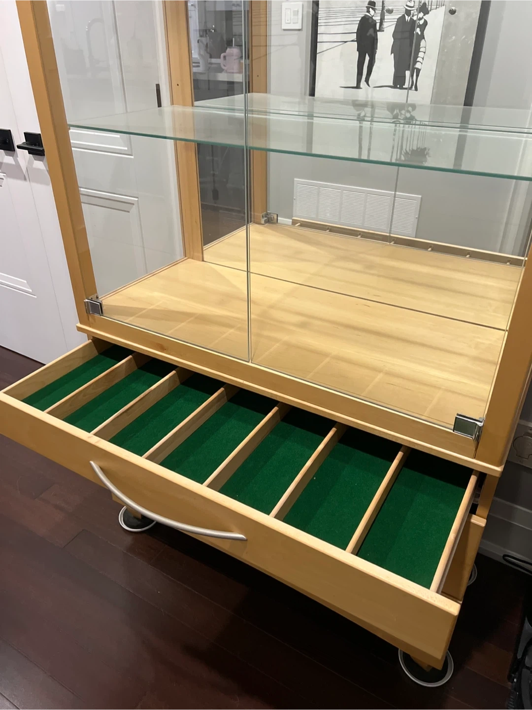 Selling a display cabinet that features glass shelves and drawers. It's perfect for showcasing your favourite items or storing essentials. Bonus feature!! - There is also a light in this cabinet. The drawers are lined with green felt. Shermag Montreal Canadian made cabinet.