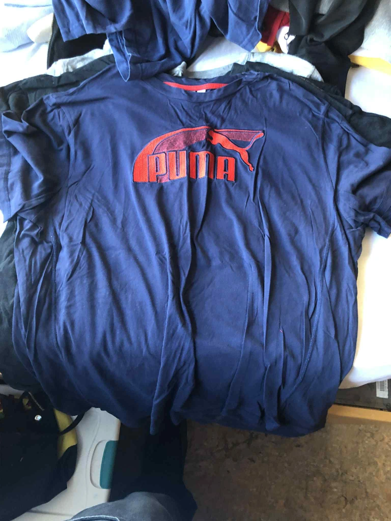A blue Puma T-shirt is available. It features a red Puma logo on the front. Perfect for casual wear! fits like xl