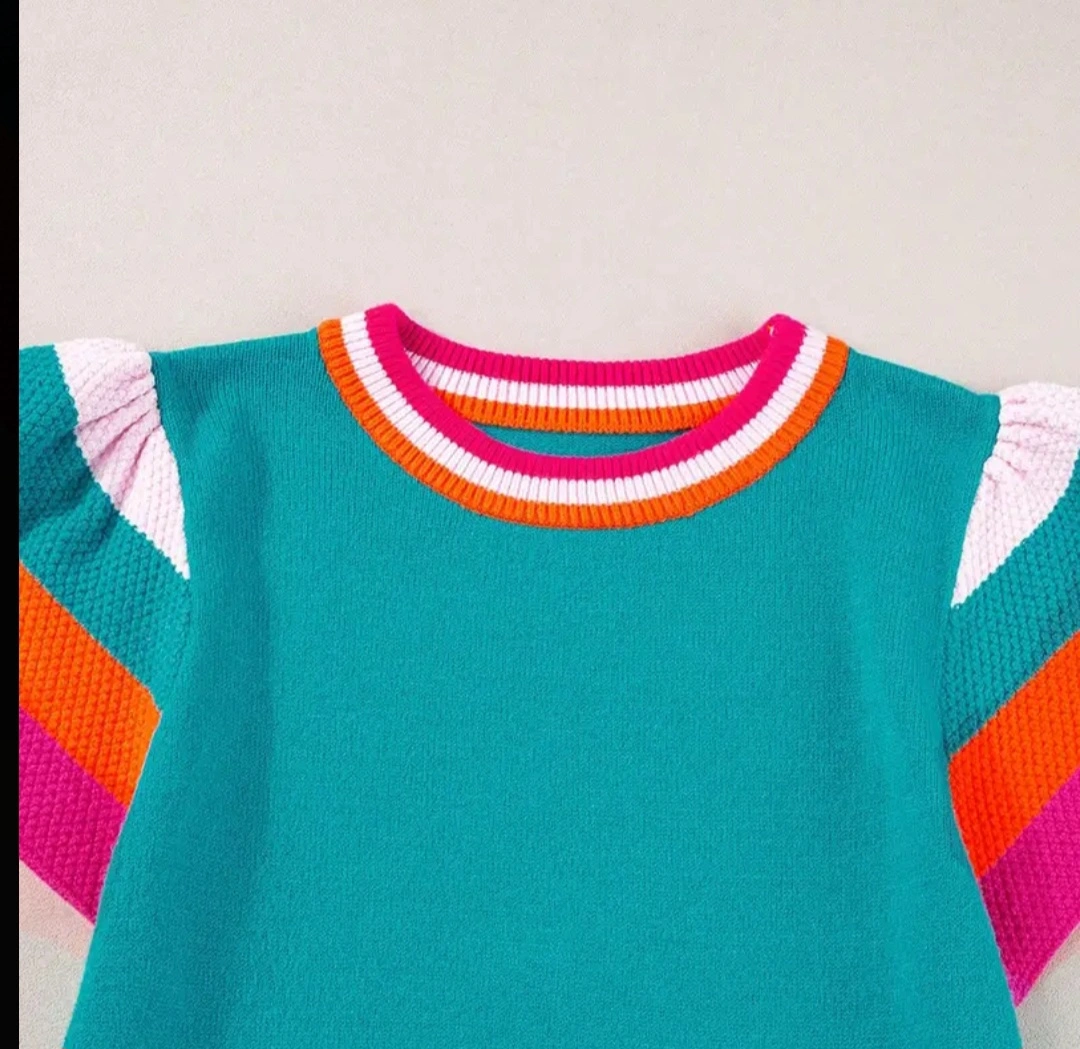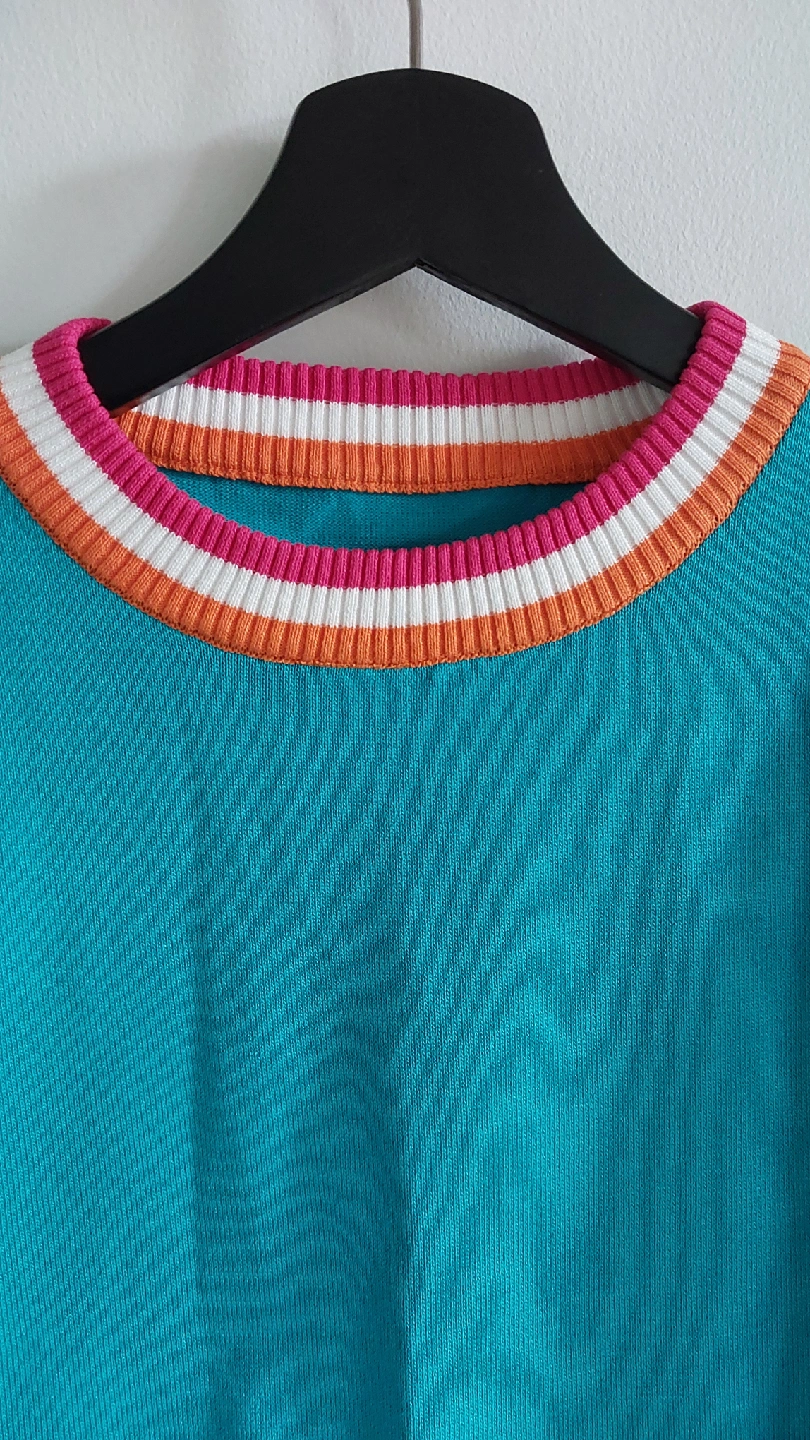 Selling a cute turquoise knit top! It features a colourful striped trim around the neck and sleeves, adding a fun pop of colour. Perfect for adding a bit of brightness to your wardrobe! one size from m to xl very stretchy Smoke free and pet free home Kindly note all sales are final and no return or refund Please check my other listings aswell😊