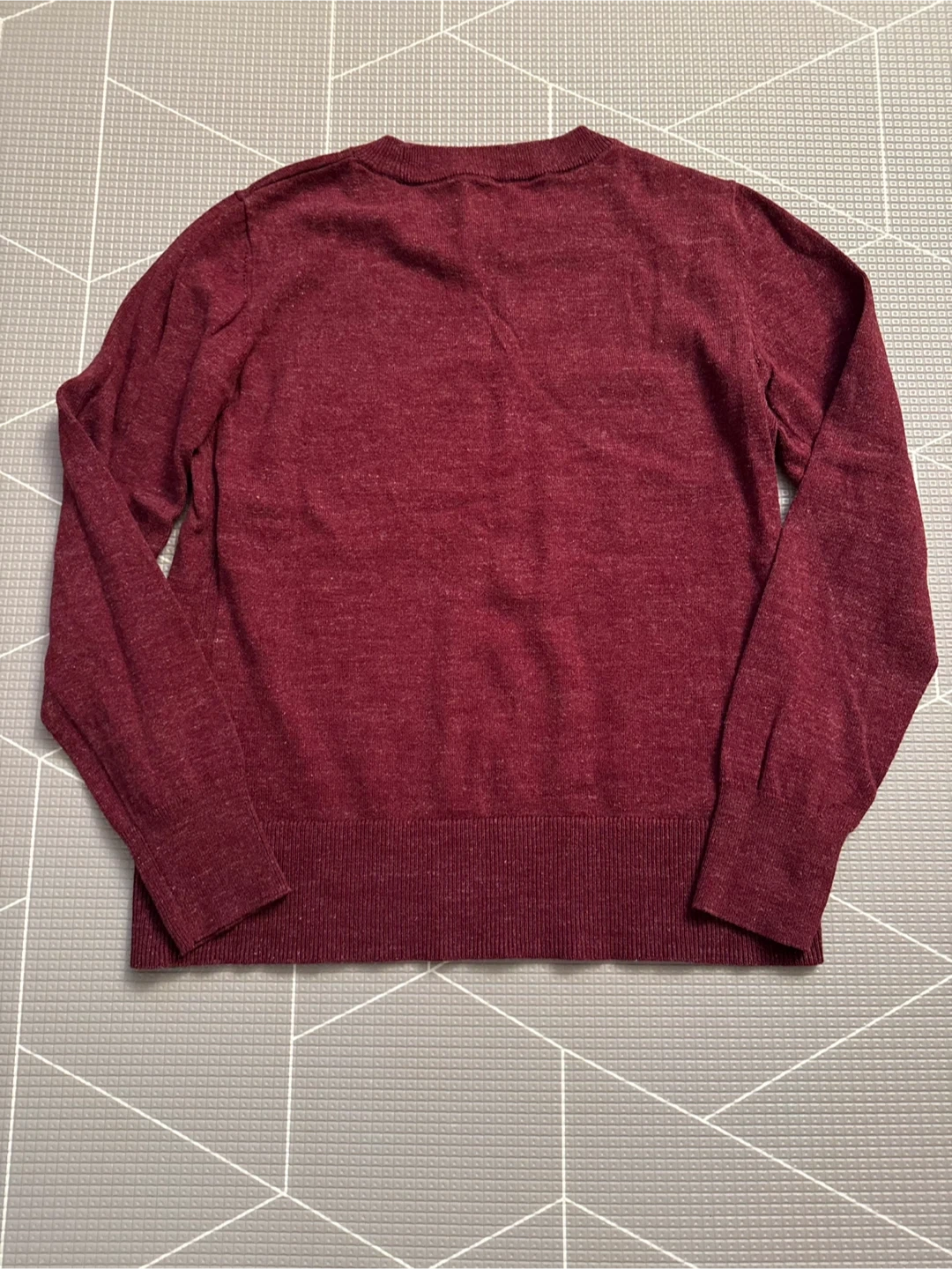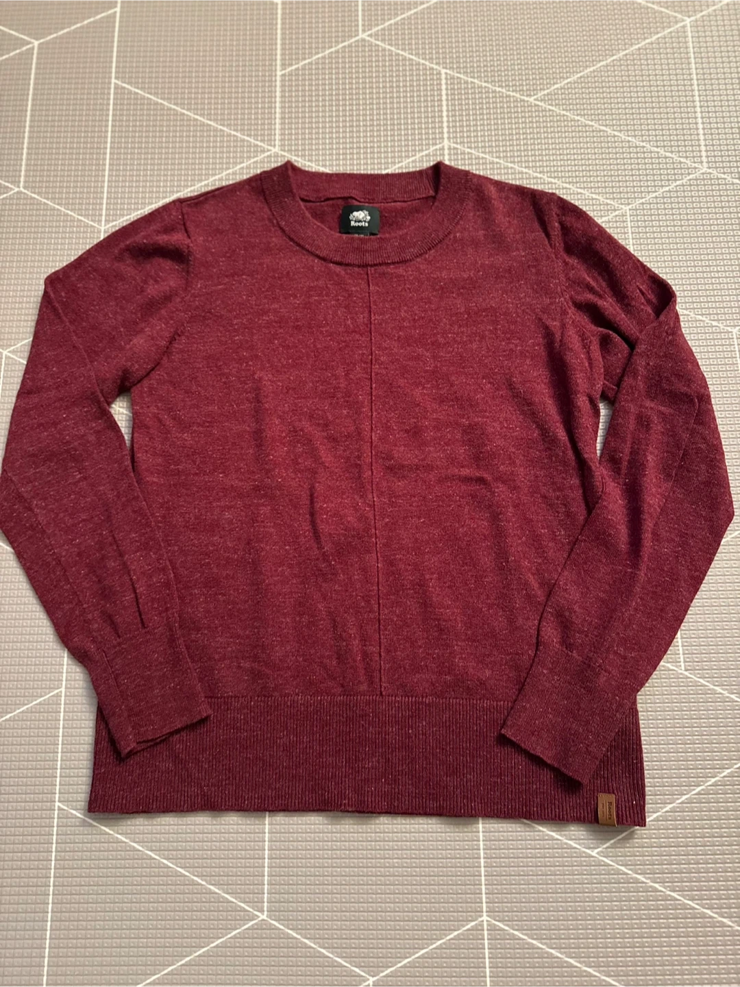 Here's a cozy Roots sweater in a lovely burgundy colour! It's a size medium and would be a great addition to your wardrobe for those cooler days