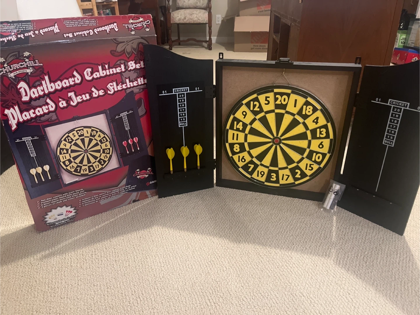 Get ready for some fun with this Churchill Dartboard Cabinet Set! It includes the dartboard, cabinet, and darts. Perfect for game nights or just practicing your aim. The cabinet has scoreboards on the inside doors. **MISSING THE 3 RED DARTS***
