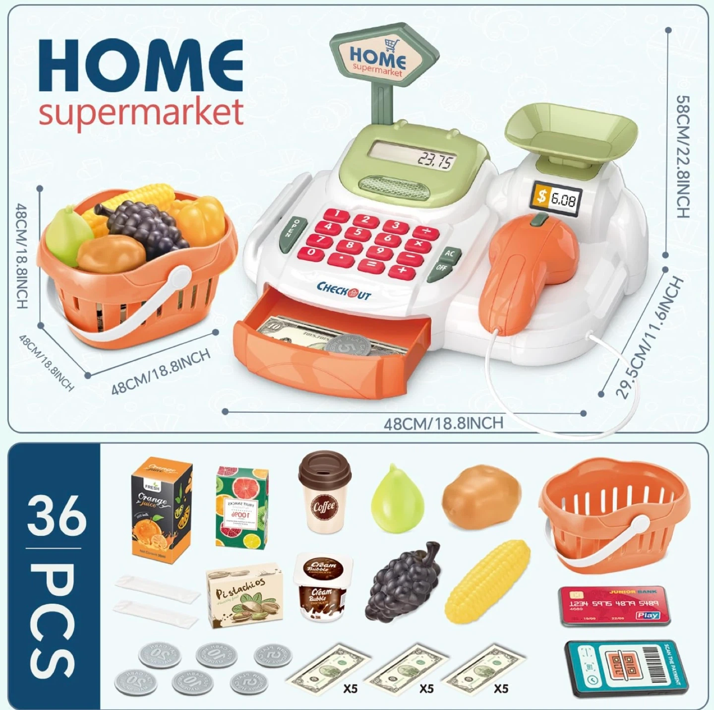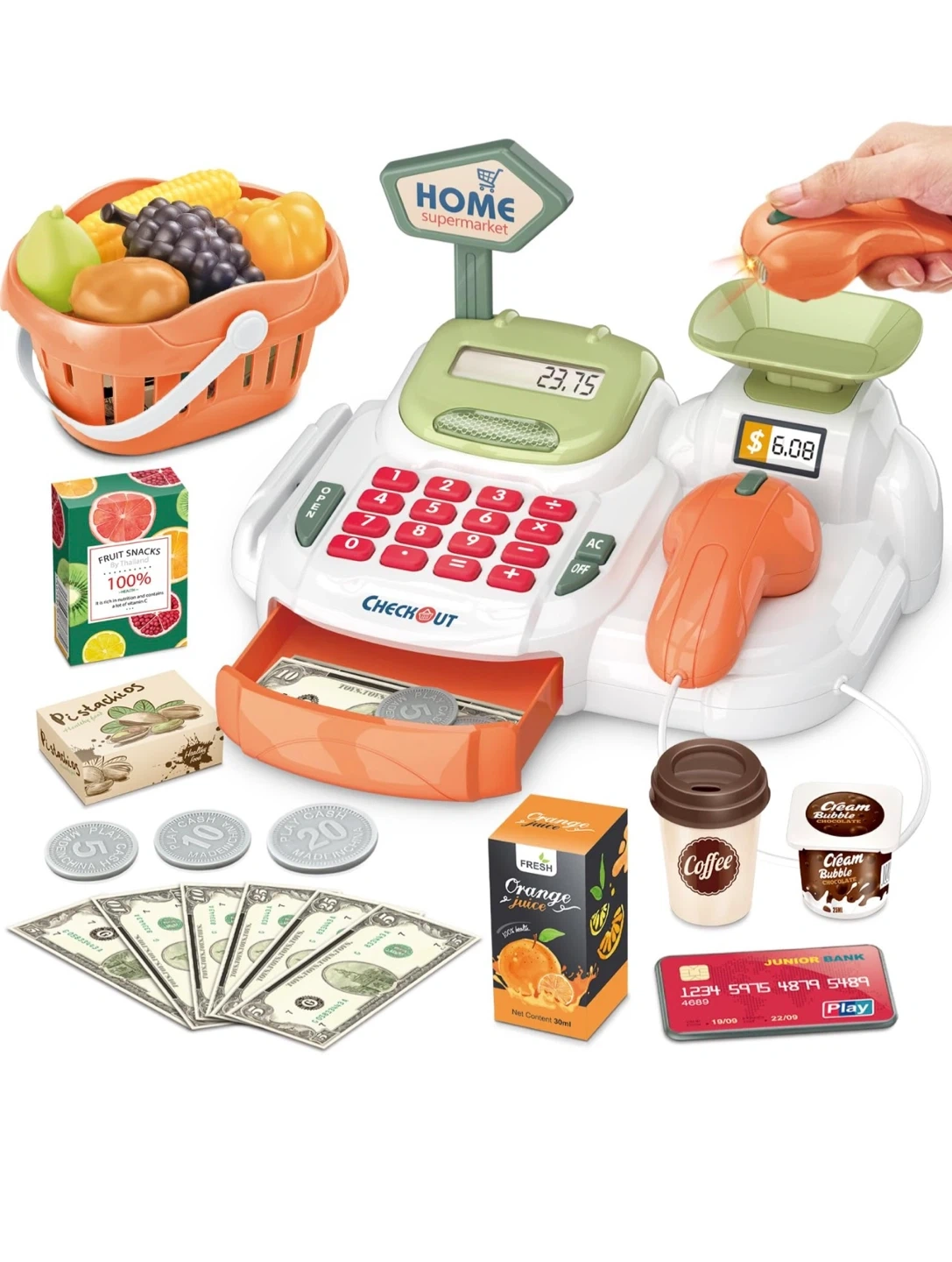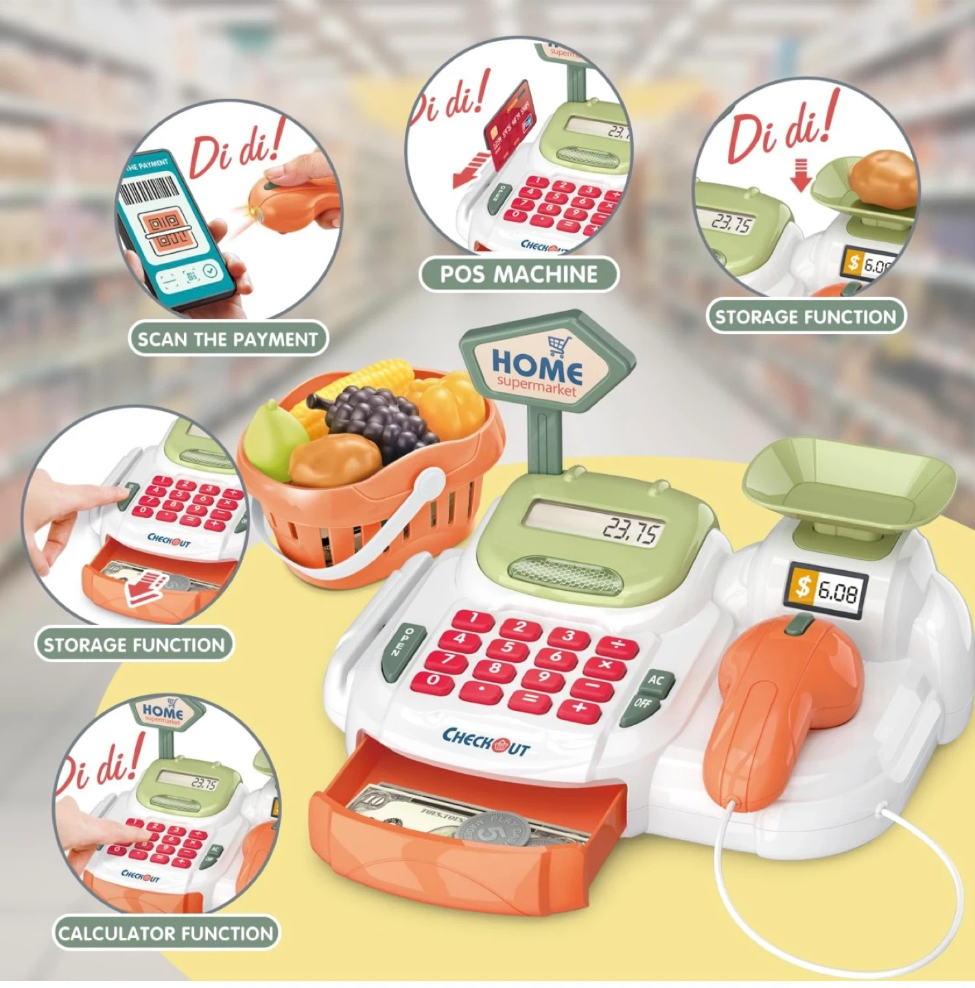 This is a fun cash register toy for kids! It comes with a variety of accessories, including play money, coins, a shopping basket, and some food items. The cash register has a working calculator and a scanner. It's perfect for pretend play and helps kids learn about money and math. The dimensions are 48cm x 48cm x 29.5cm.