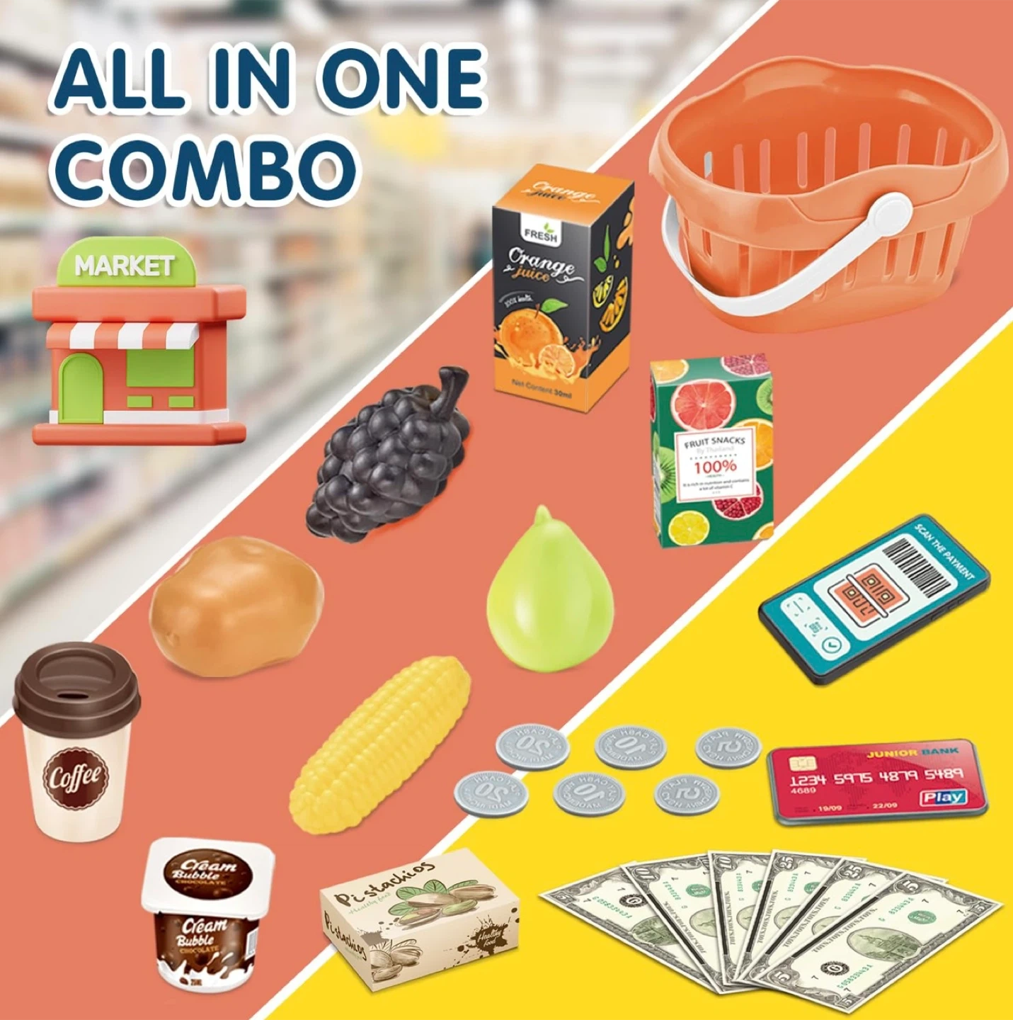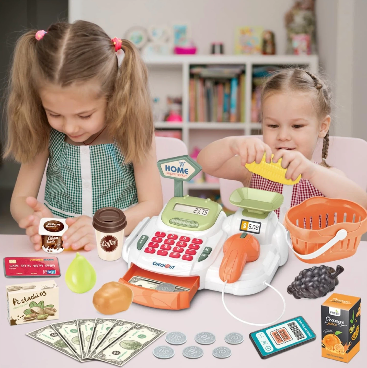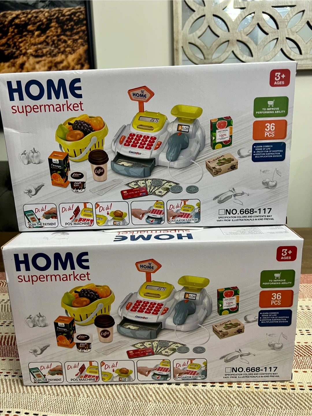 This is a fun cash register toy for kids! It comes with a variety of accessories, including play money, coins, a shopping basket, and some food items. The cash register has a working calculator and a scanner. It's perfect for pretend play and helps kids learn about money and math. The dimensions are 48cm x 48cm x 29.5cm.