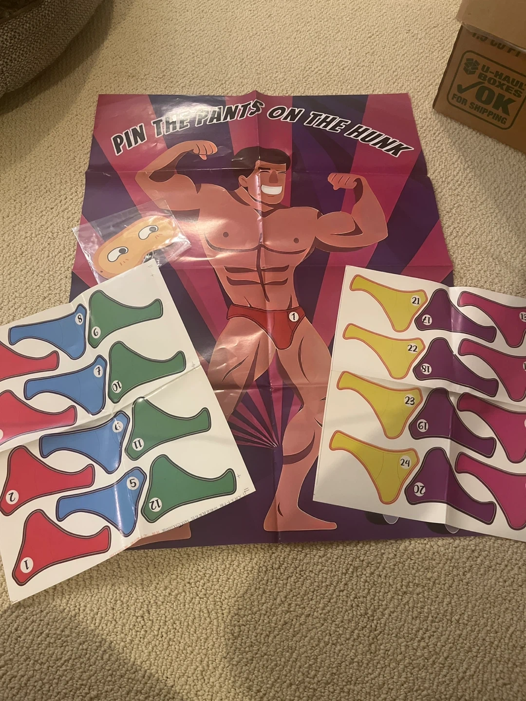 Get ready for some laughs with this "Pin the Pants on the Hunk" game! New, never played. All the numbered pants are included, so you're all set for some silly fun
