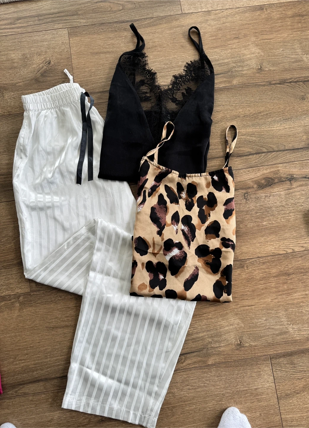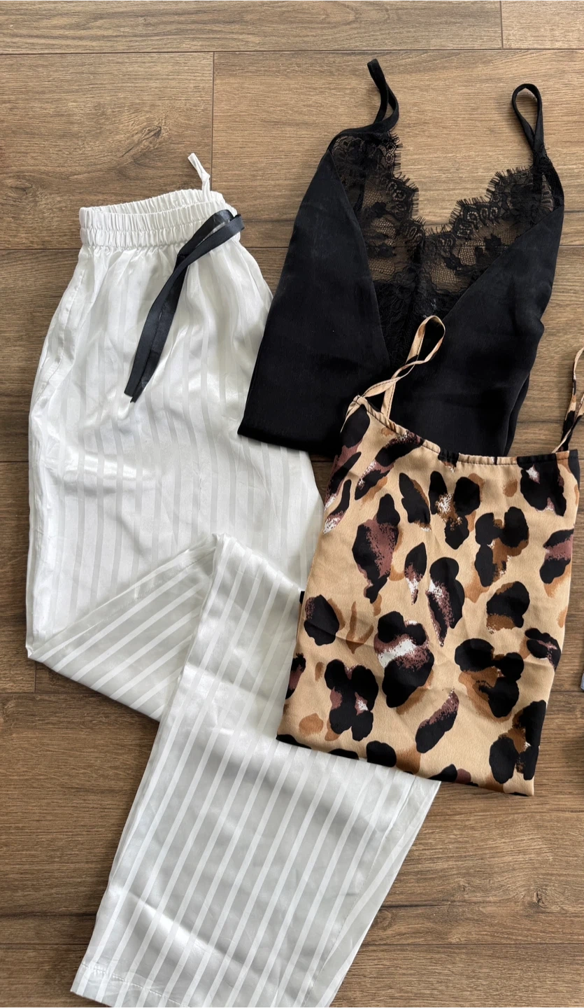 Bundles of cosy pajama! Brand name Chaser in nice light blue color , a red satin short pyjama , white striped pants, a black lace cami, a leopard cami. Comes from a clean home pets free & smoke free. $20 for everything.