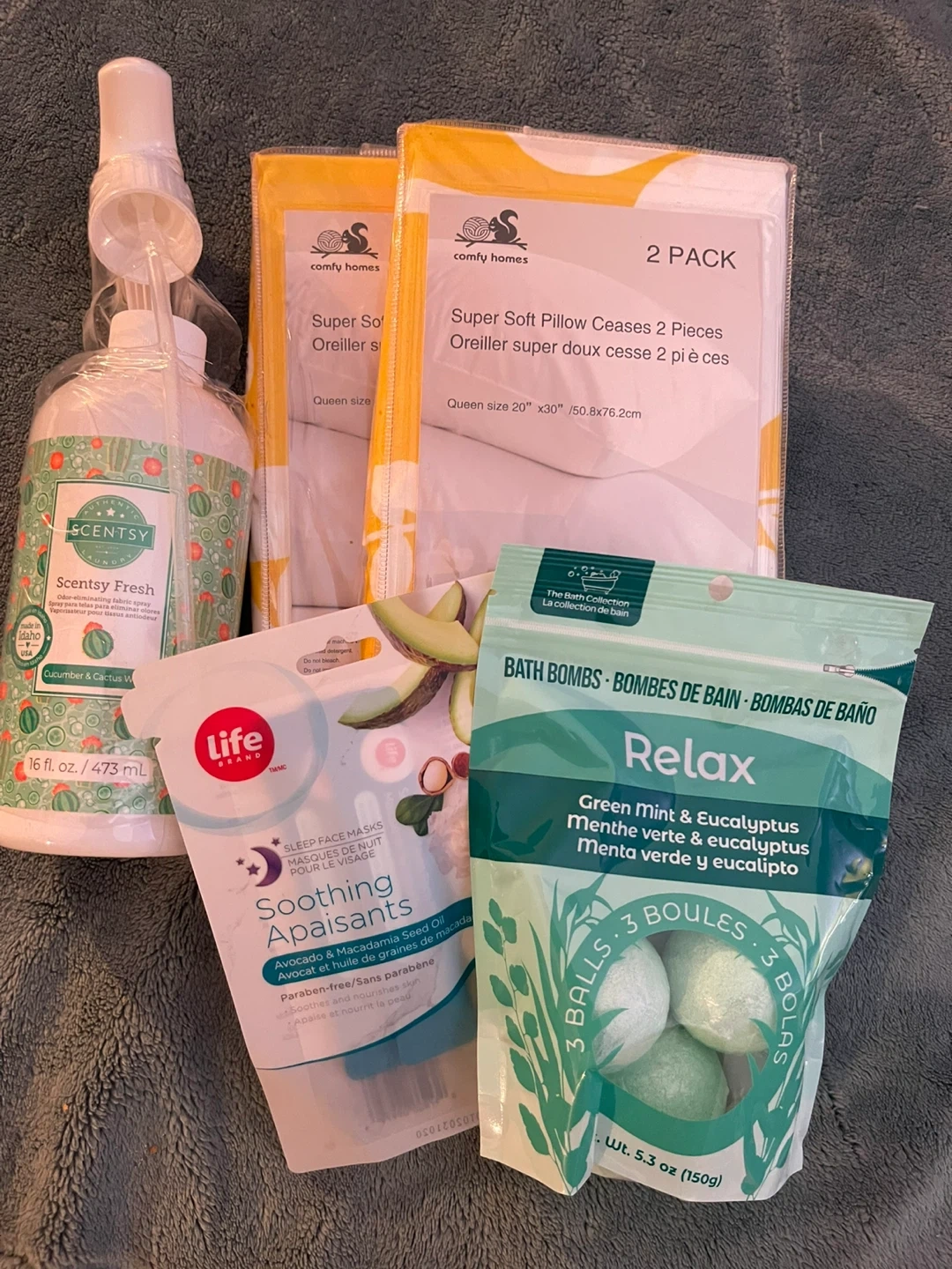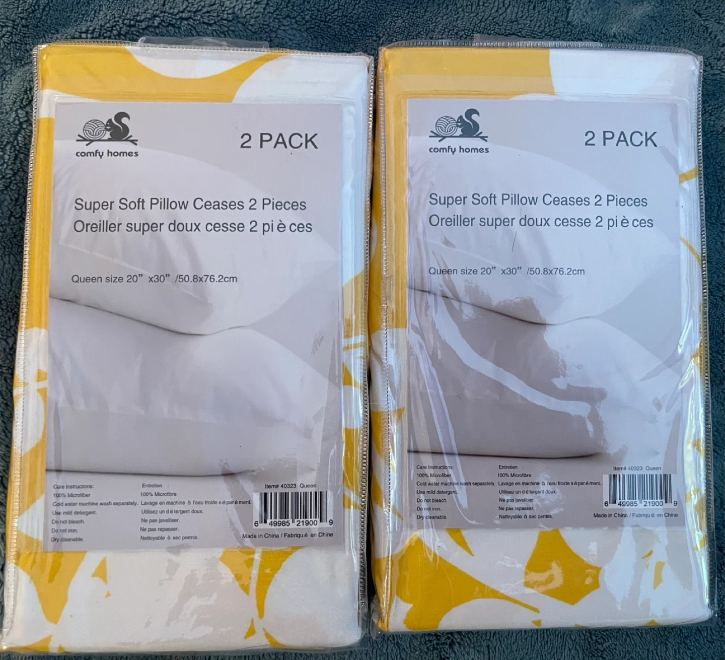 Selling a 2-2 pack of Comfy Homes pillowcases. They're super soft and brand new in the packaging! Each pillowcase is Queen size: 20" x 30" / 50.8 x 76.2cm. Made of 100% microfiber and machine washable. 3 bath bombs Green Mint & Eucalyptus. Cucumber & Cactus Water Fabric Spray. Avocado and Macadamia Seed oil Face Masks. Lobby Pick Up.