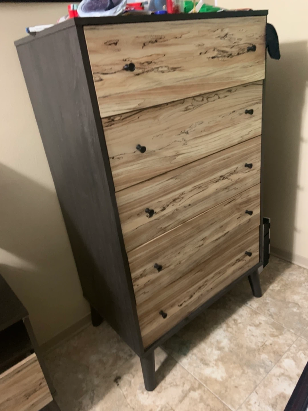 Selling a lovely 5-drawer chest with a unique wood grain pattern! The sides are a dark espresso colour and it features sleek black knobs. Perfect for adding some storage and style to any room! It is too high for my son and not enough storage for his clothes and need to upgrade.