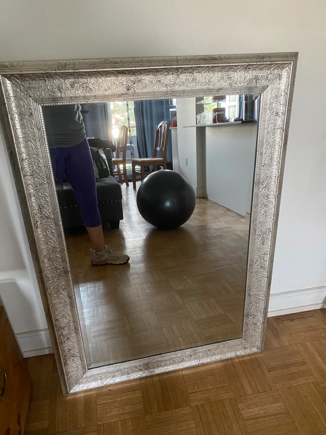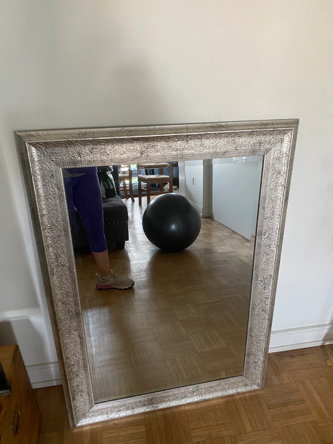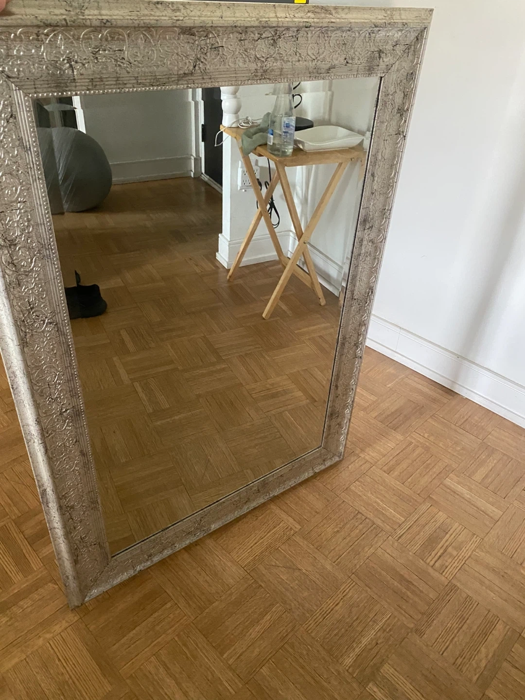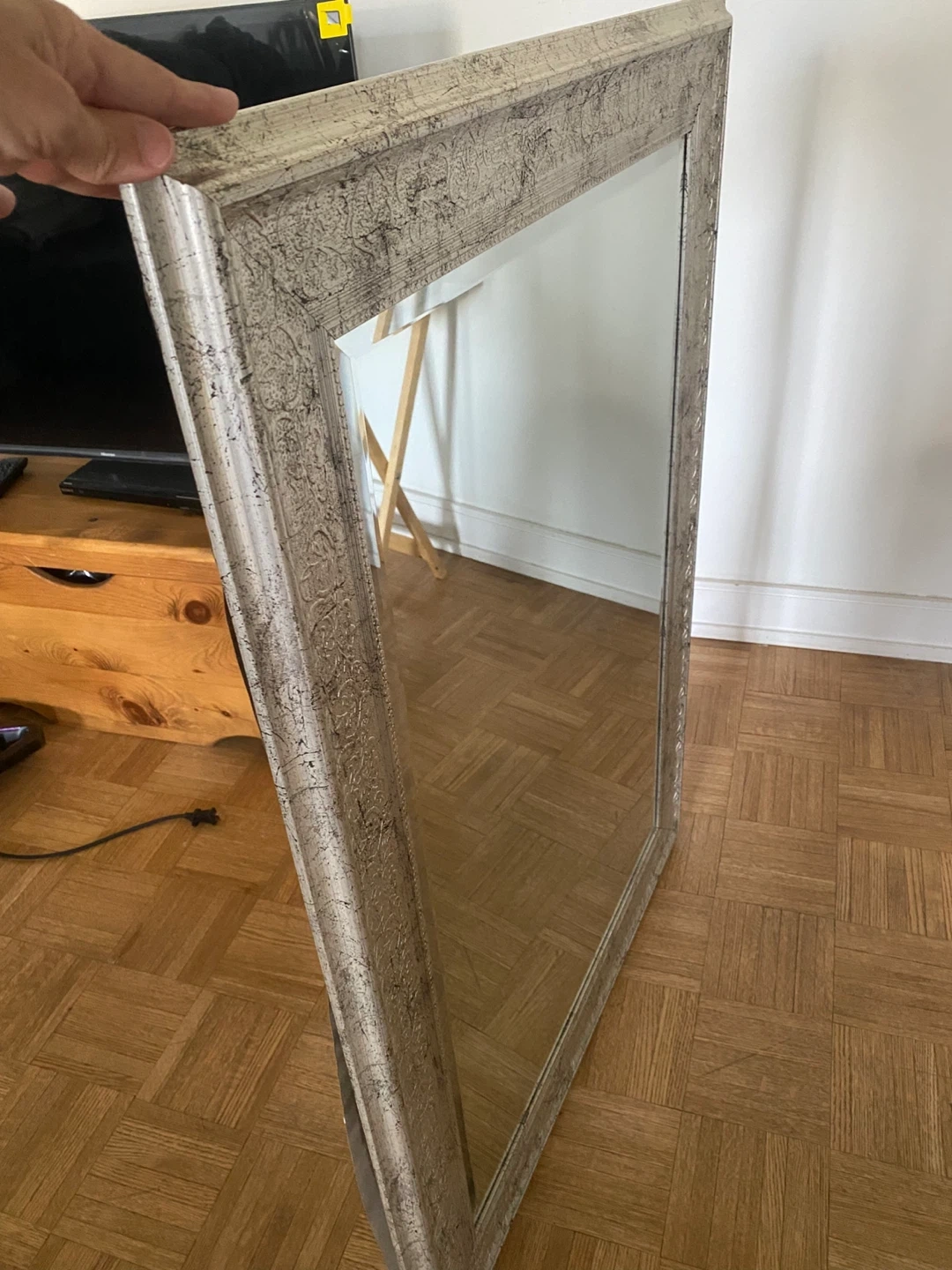 Selling a large framed wall mirror. The frame has a decorative pattern and a distressed finish, adding a touch of elegance to any room. It's in great condition and ready to be hung!