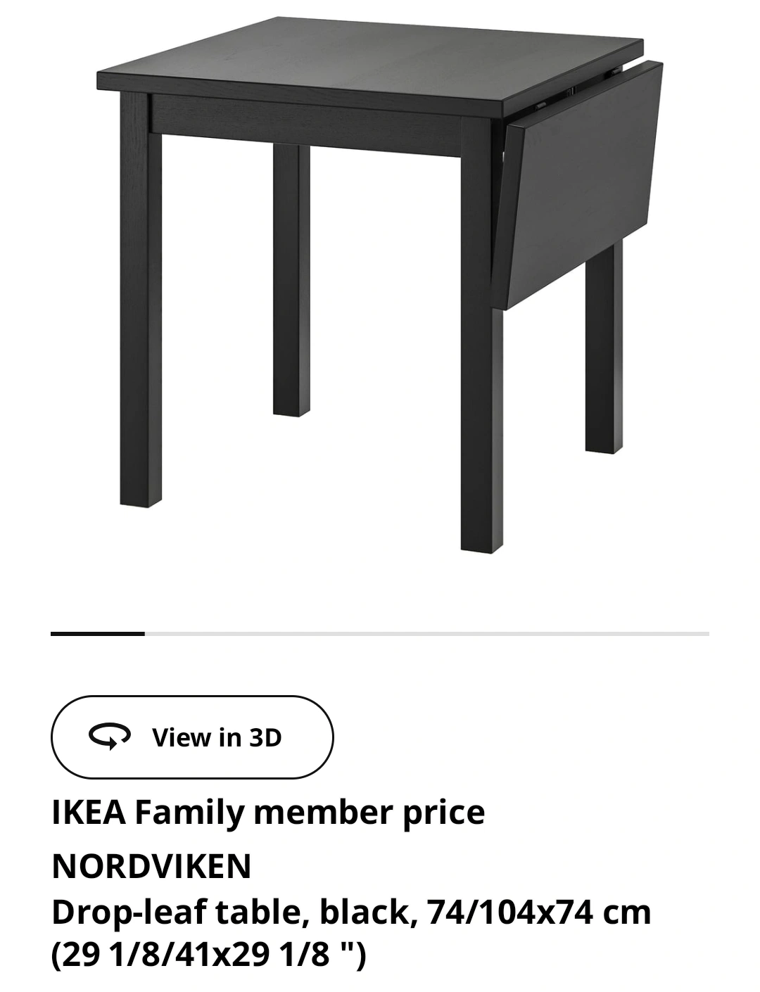 Selling a black IKEA NORDVIKEN drop-leaf table! It's in great shape and perfect for smaller spaces. The dimensions are 74/104x74 cm (29 1/8/41x29 1/8 "). (Open to offers below listed price)