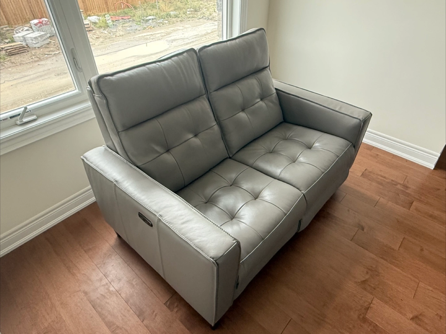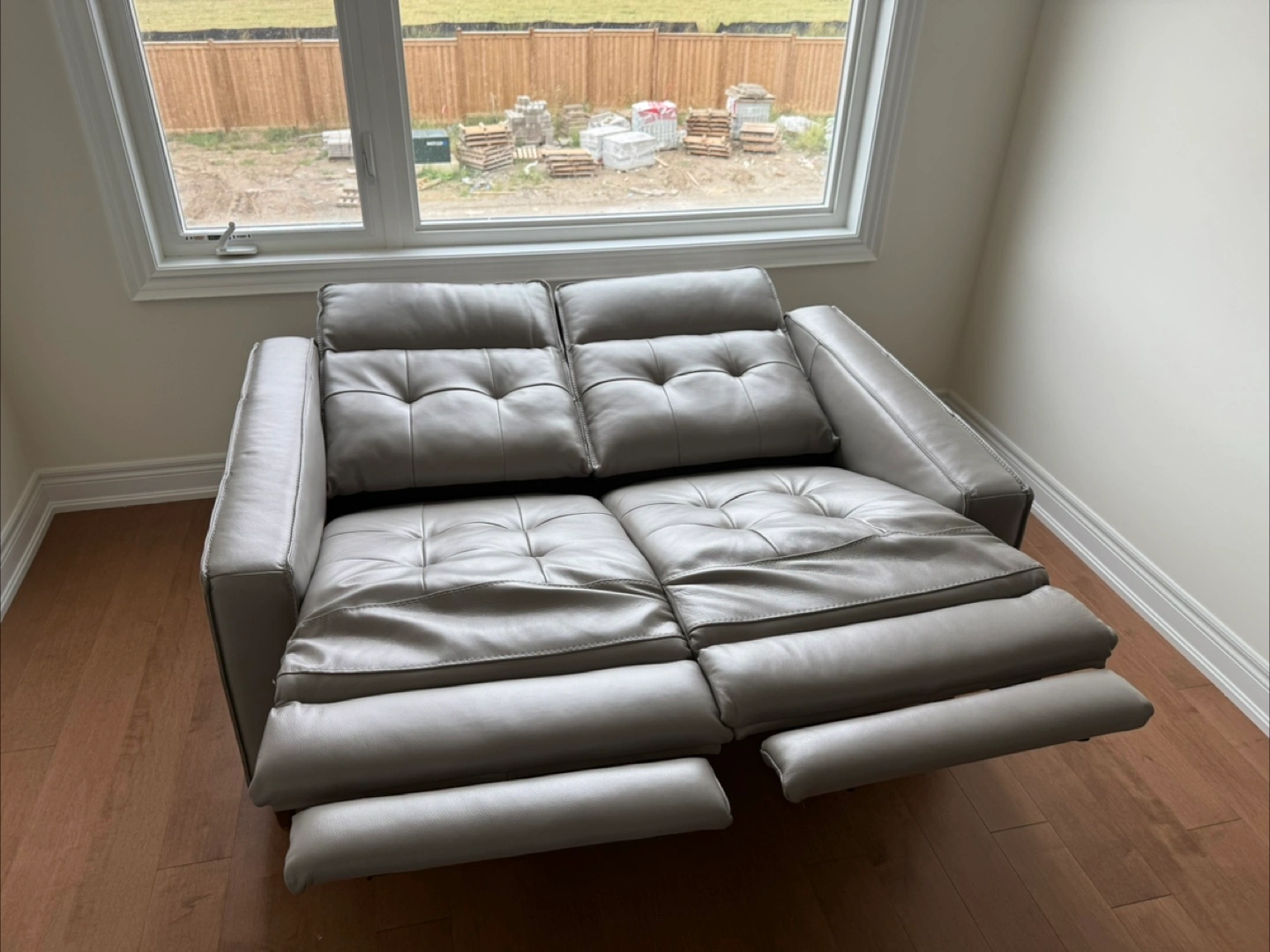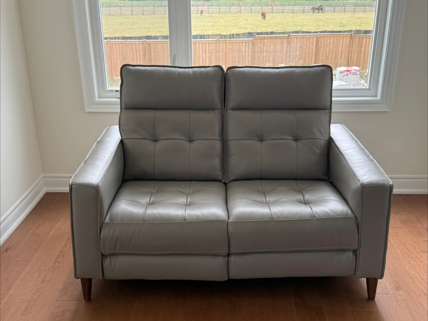Selling a lovely grey leather loveseat recliner. It's in great condition and would be a perfect addition to any living room or den. The recliner function works smoothly. It's very comfortable and stylish!