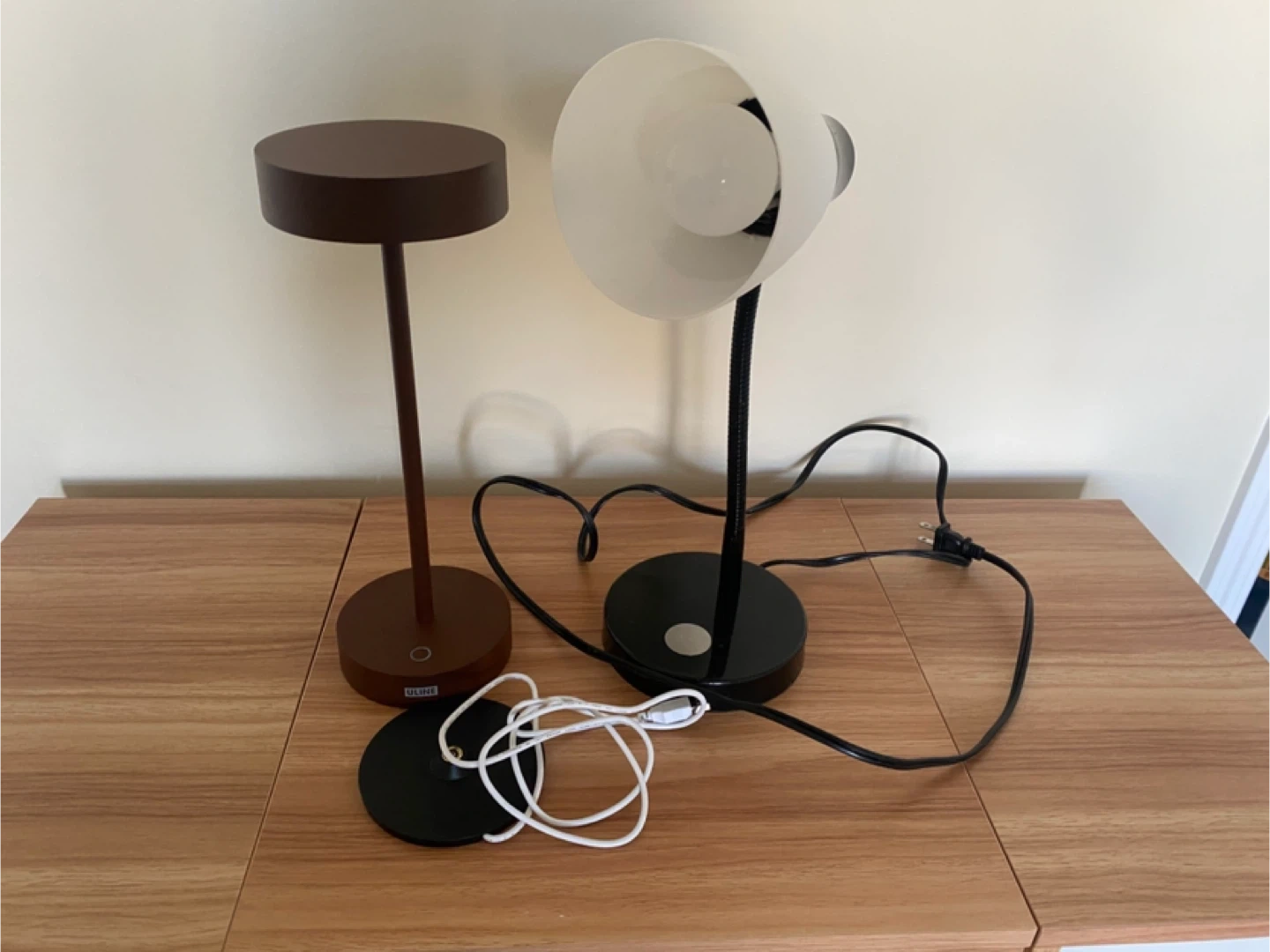 Two desk lamps for sale! One is a sleek brown and the other is a classic black. Both are in great shape and ready to light up your workspace Brown colour - wireless and comes with its own usb charging wire . It is 10 dollars for both .