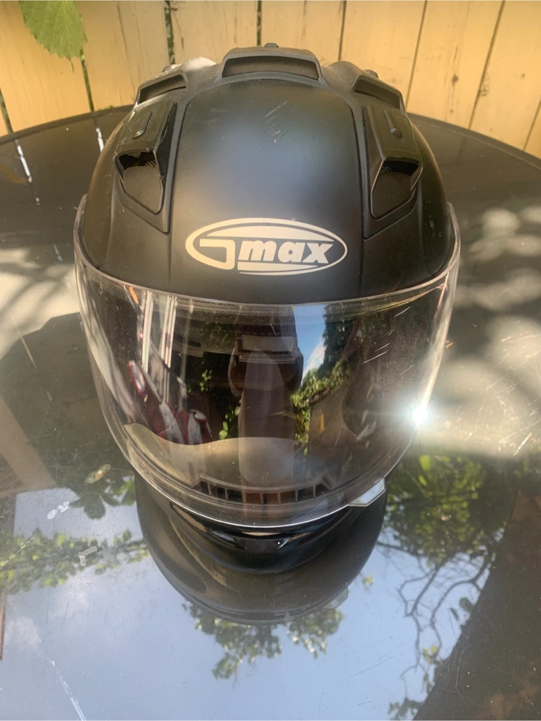 Selling a black GMAX motorcycle helmet. It has some signs of use but is still in good condition for riding. Please take a look at the pictures!