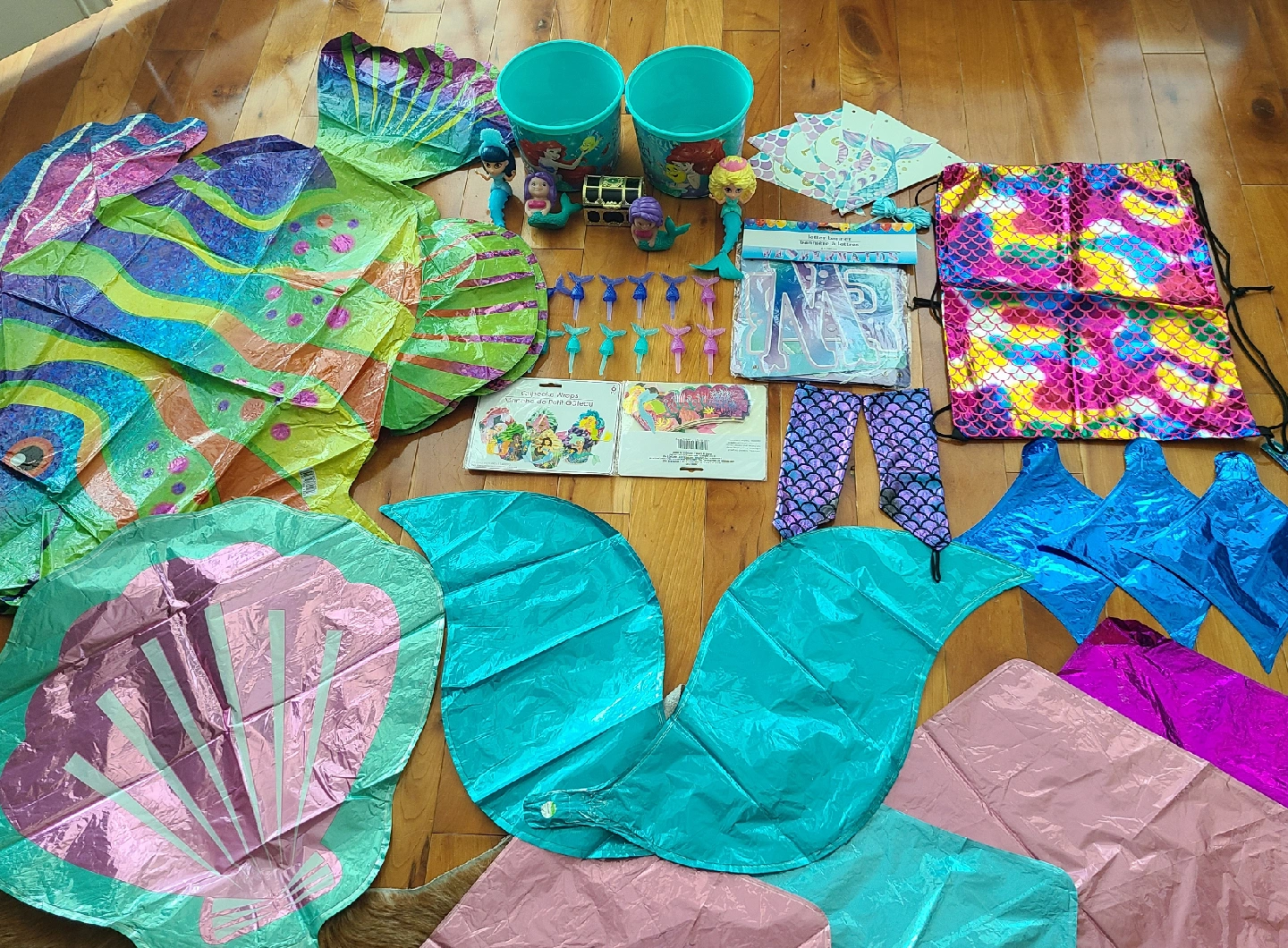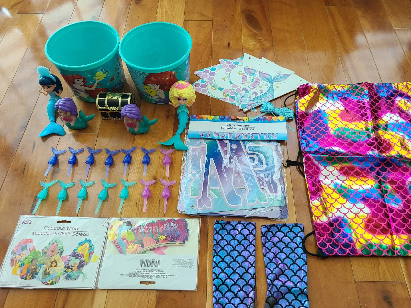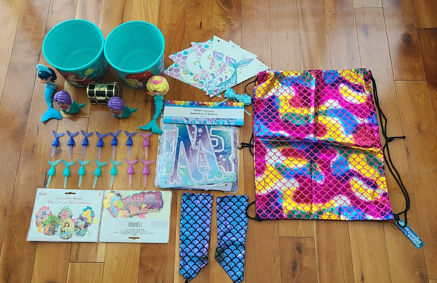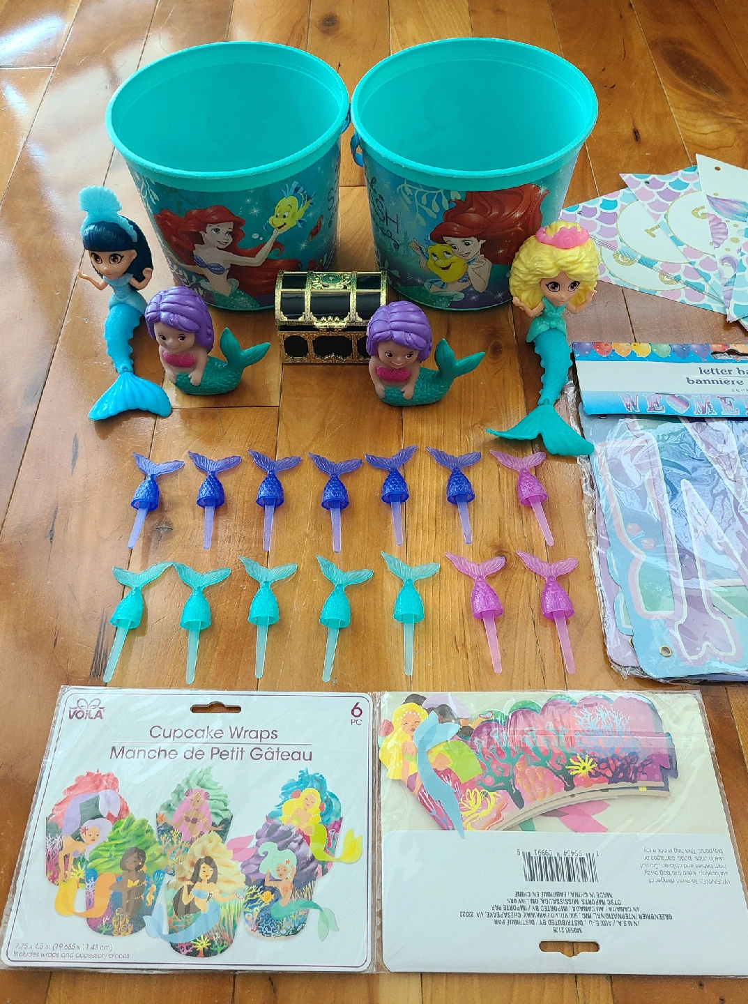 Perfect for a birthday or any special occasion 2 Buckets 4 Mermaids (can be cake topper) 1 Jewelry box (can be cake topper) 1 Happy Birthday Banner 1 We Love Mermaids Banner 12 capcake toppers (new) 14 mermaid tail capcake toppers 1 mermaid print bag With purchase of decor - balloons free.