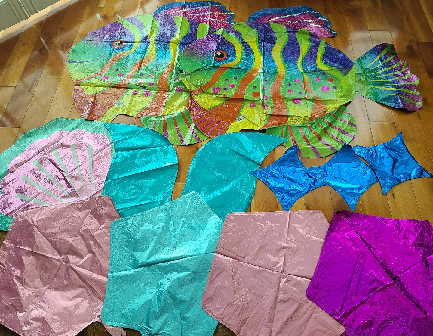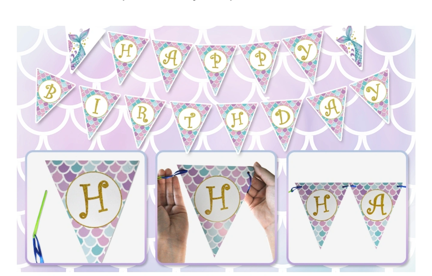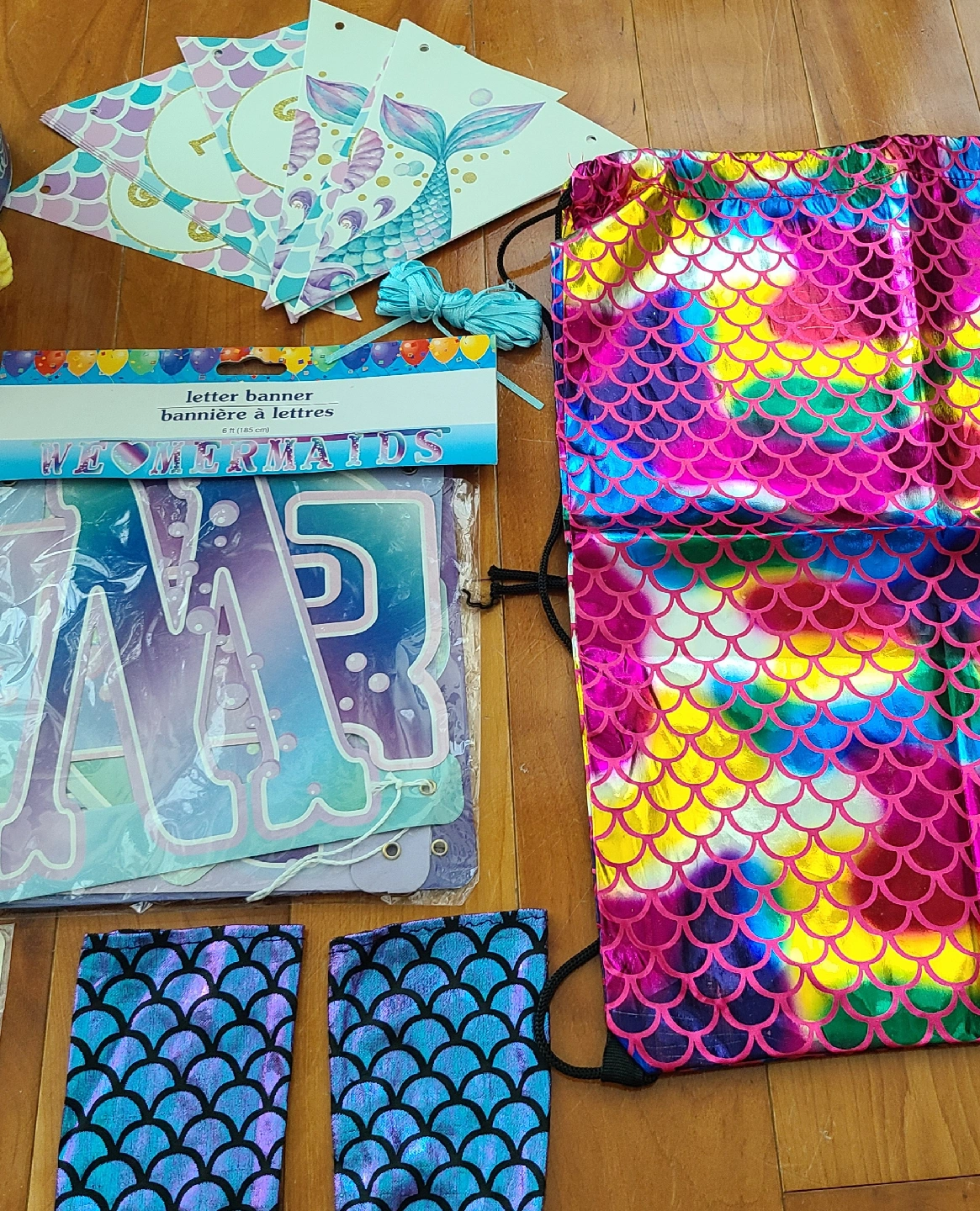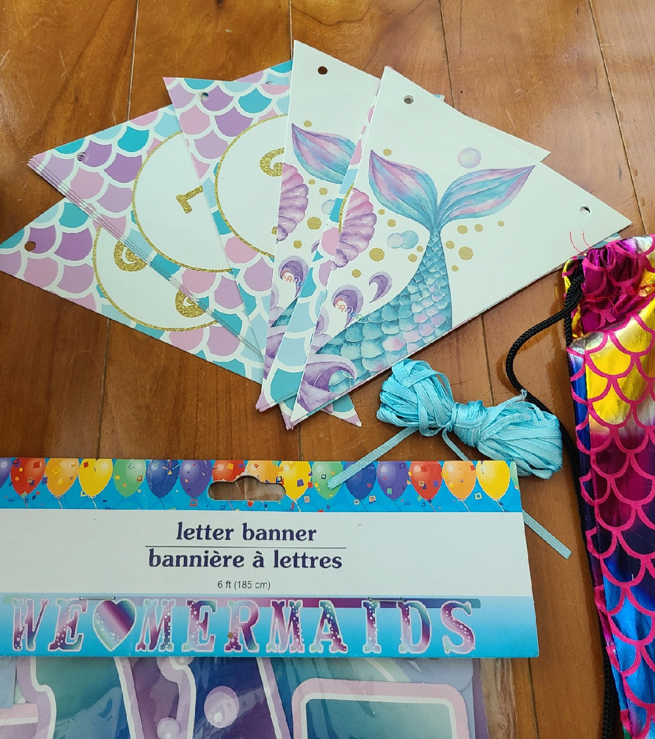 Perfect for a birthday or any special occasion 2 Buckets 4 Mermaids (can be cake topper) 1 Jewelry box (can be cake topper) 1 Happy Birthday Banner 1 We Love Mermaids Banner 12 capcake toppers (new) 14 mermaid tail capcake toppers 1 mermaid print bag With purchase of decor - balloons free.