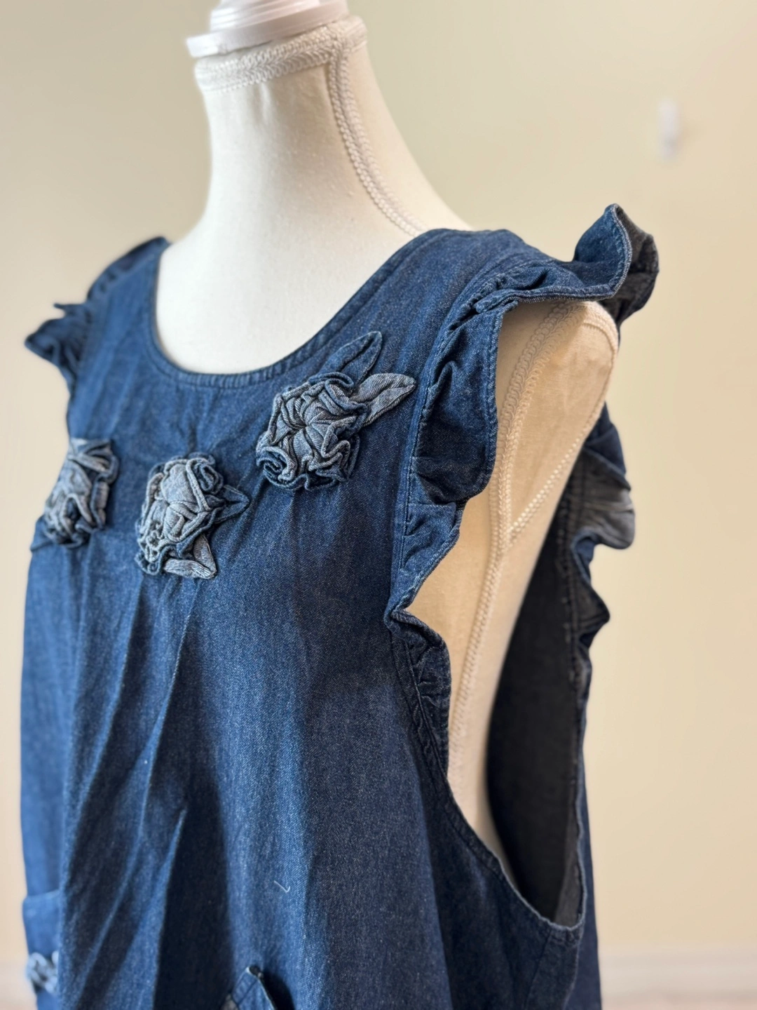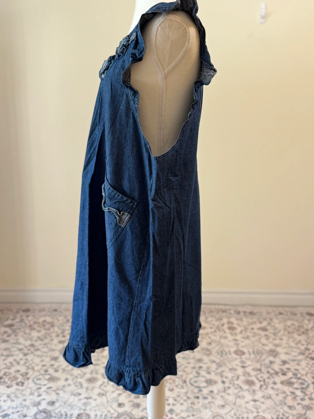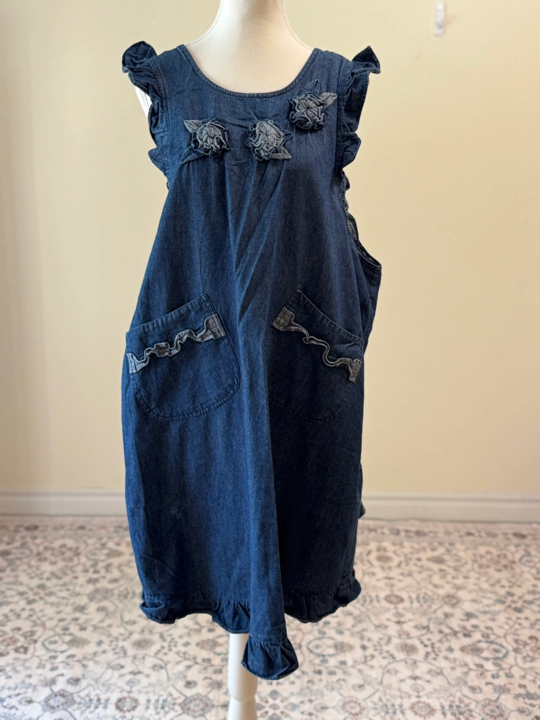 📌 Description A unique vintage denim layered dress made from 100% cotton. This loose-fit piece is designed for layering, styled with ruffled details, rosette appliqués, and roomy front pockets. Perfect for casual wear, cottagecore styling, or as a versatile pinafore for year-round use. The relaxed silhouette makes it comfortable and effortlessly cute, whether worn as a dress or styled as a layering smock. ✔ Material • 100% Cotton ✔ Size: Flat Measurements • Chest / Ribcage width: 57 cm (22.4”) • Front Length: 98.5 cm (38.7”) • Back Length: 79 cm (31.1”) • Tagged size: Free (recommended S-XL for Women depending on desired fit) Please refer to detailed measurements for best fit. ✔ Features • Sleeveless with ruffle trim details • Rosette floral appliqué across the chest • Two large front pockets with ruffle trim • Button-down back closure • Relaxed and oversized silhouette – ideal for layering • Works as a pinafore/apron dress or standalone casual dress 📌 Condition • Overall in excellent vintage or secondhand condition. Due to the nature of items, there may be minor signs of wear, such as slight stains or small imperfections. • Note: Slight faded mark at the lower right hem (see photos).