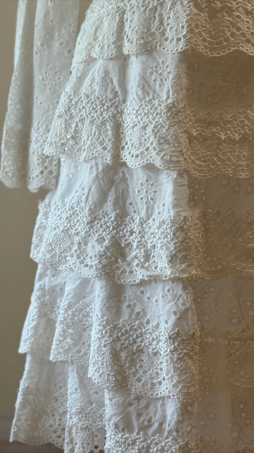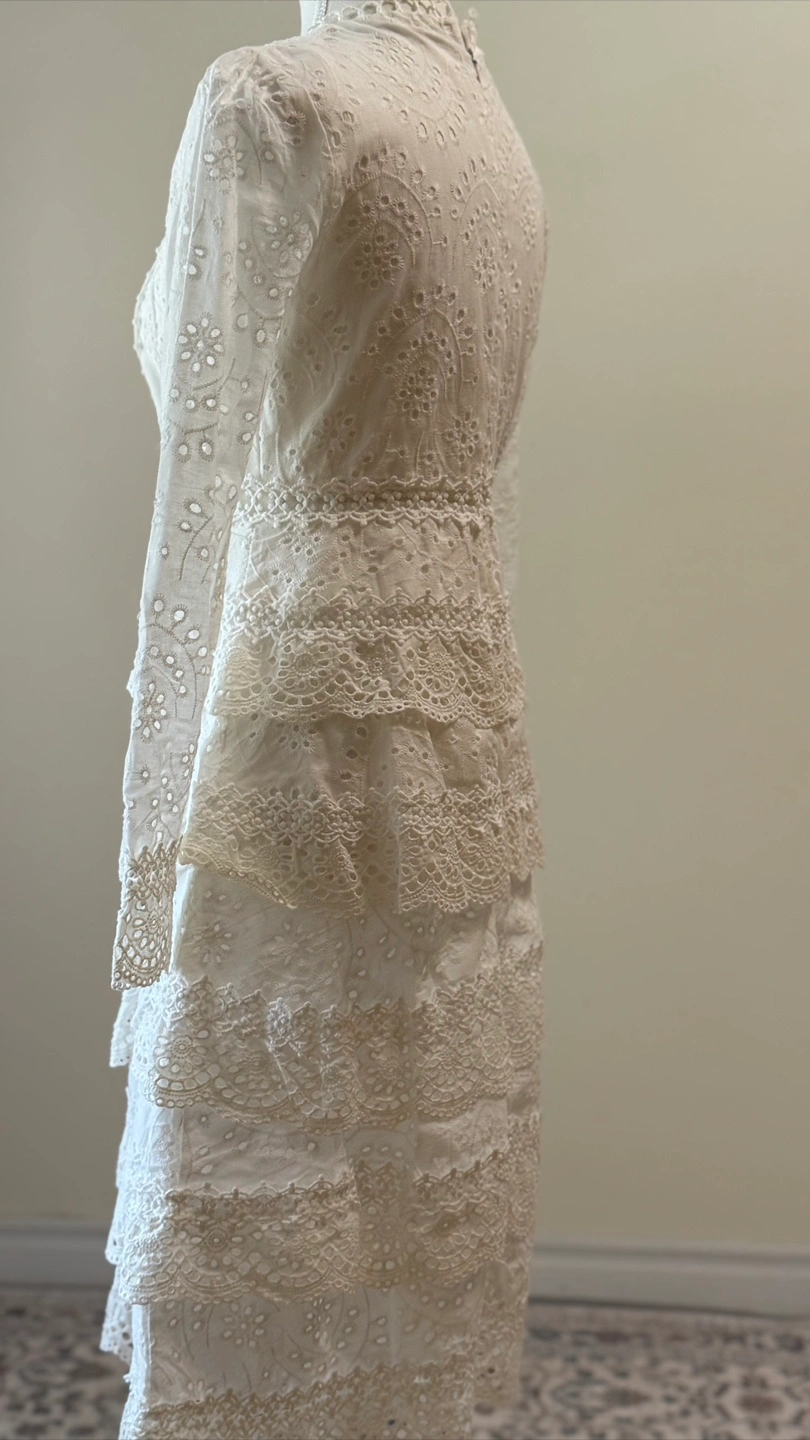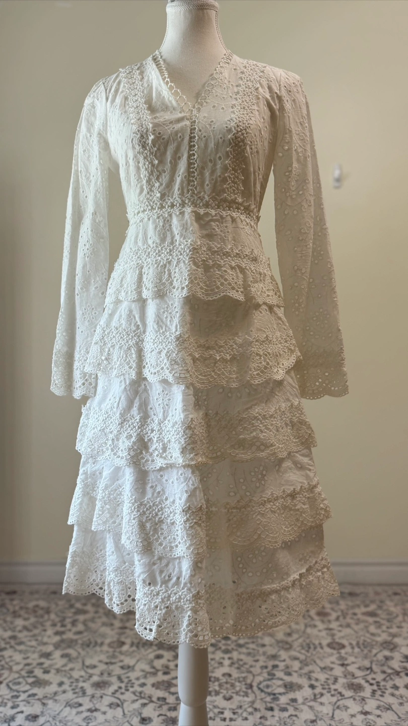 š Description A stunning vintage white lace mini dress with intricate eyelet embroidery and tiered ruffle layers. This romantic piece is perfect for a self-wedding, bridal shower, engagement photos, or special occasions. The feminine silhouette and delicate cotton lace details make it an unforgettable piece for cottagecore, boho, or vintage-inspired styling. ā Material ⢠No Label (with embroidered lace eyelet details) ā Size: Flat Measurements ⢠Shoulder: 36 cm (14.1ā) ⢠Chest (pit to pit): 42 cm (16.5ā) ⢠Sleeve length: 59 cm (23.2ā) ⢠Total length: 98 cm (38.6ā) ⢠Tagged size: Not indicated (recommended XSāS for Women depending on desired fit) Please refer to detailed measurements for best fit. Note: Bust measurement runs small, please check sizing carefully before purchase. ā Features ⢠Long sleeves with embroidered eyelet detail ⢠Deep V neckline with lace trim ⢠Tiered layered ruffle skirt with scalloped hem ⢠Back zip closure ⢠Romantic cottagecore / bridal / boho style š Condition ⢠Overall in excellent vintage or secondhand condition. Due to the nature of items, there may be minor signs of wear, such as slight stains or small imperfections.