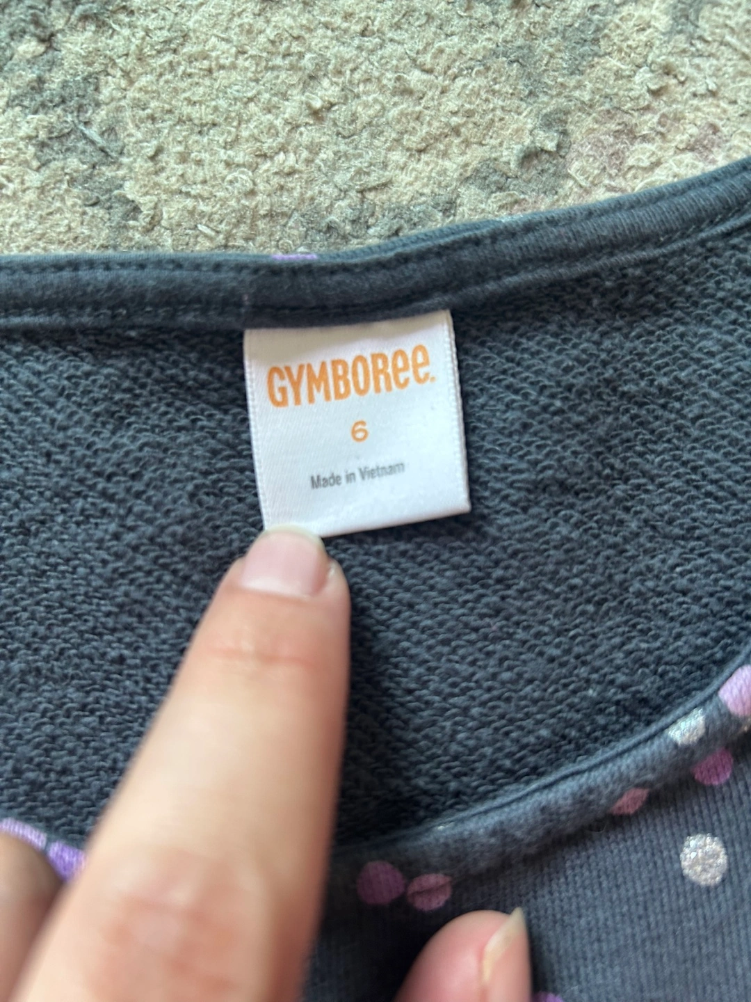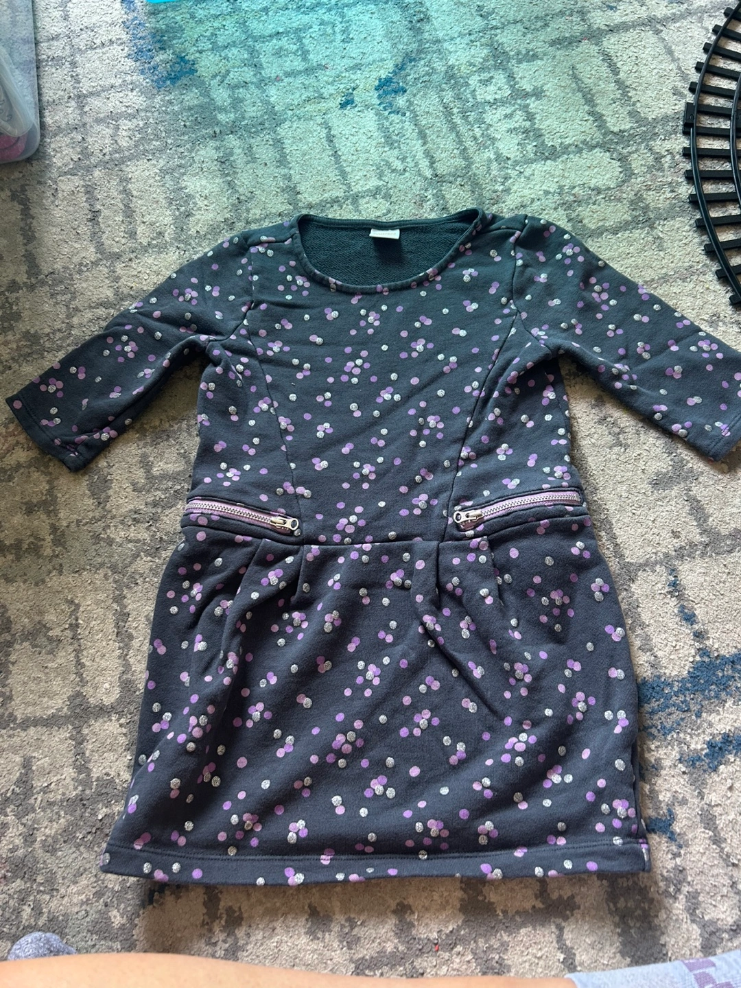 A cute Gymboree dress in size 6. It features a dark grey colour with purple and white polka dots. Perfect for a little one!