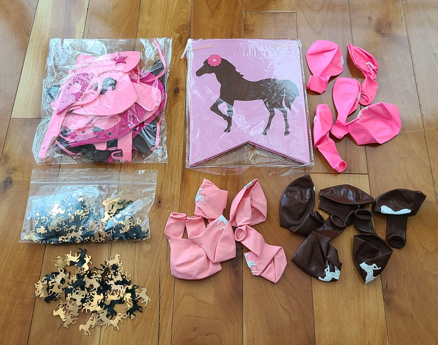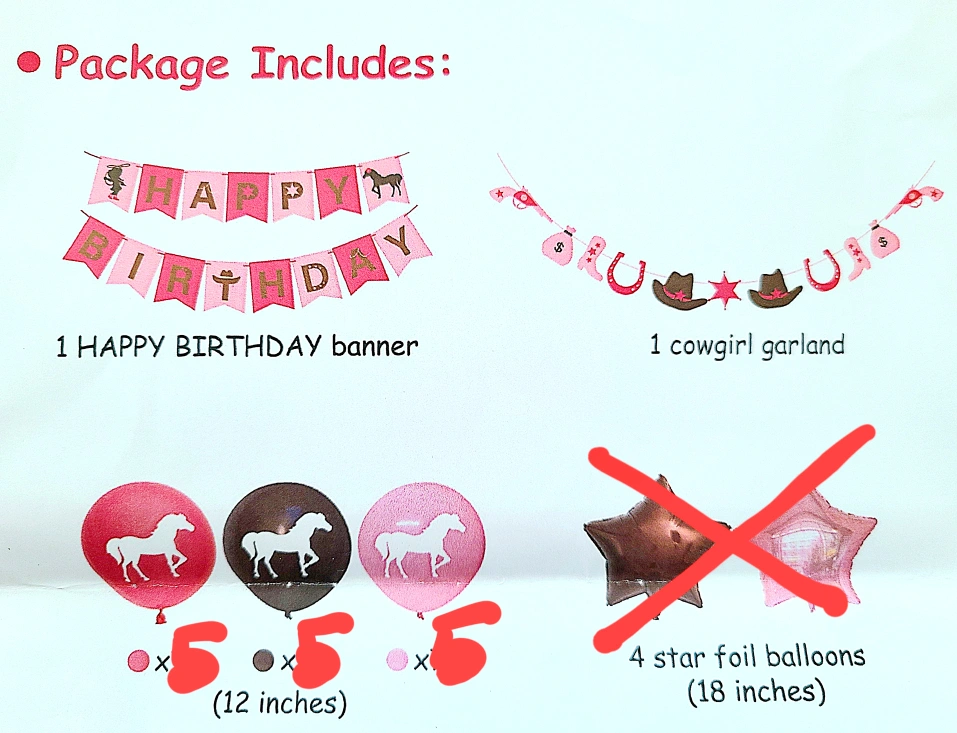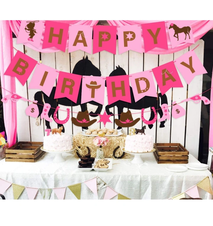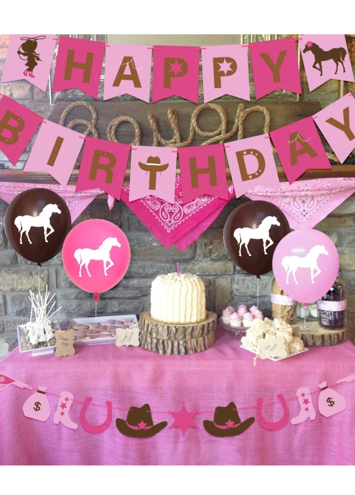 Western cowgirl themed party decoration set. It includes: -1 Happy Birthday banner -1 A cowgirl garland -15 Balloons with horse designs Perfect for a birthday celebration!