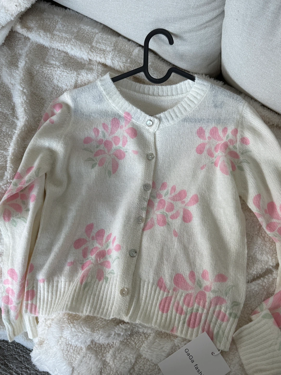Selling a cardigan with a floral design! It's new with tag and perfect for layering. The cardigan features a delicate floral pattern in pink on a cream-coloured base. It has a classic button-down style that can be dressed up or down, making it a versatile addition to your wardrobe DT queen st near Aritiza pickup only