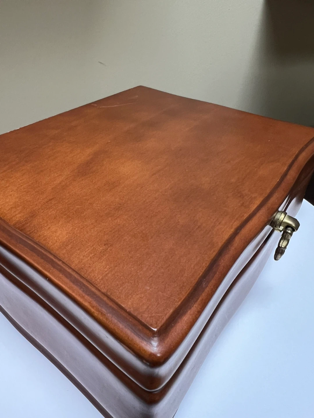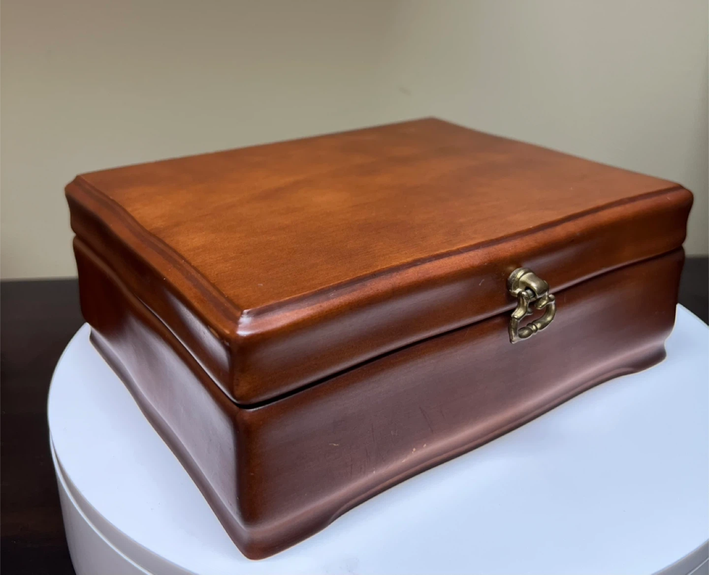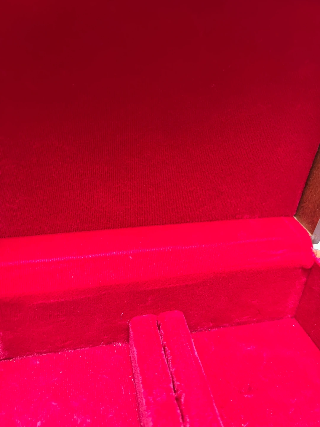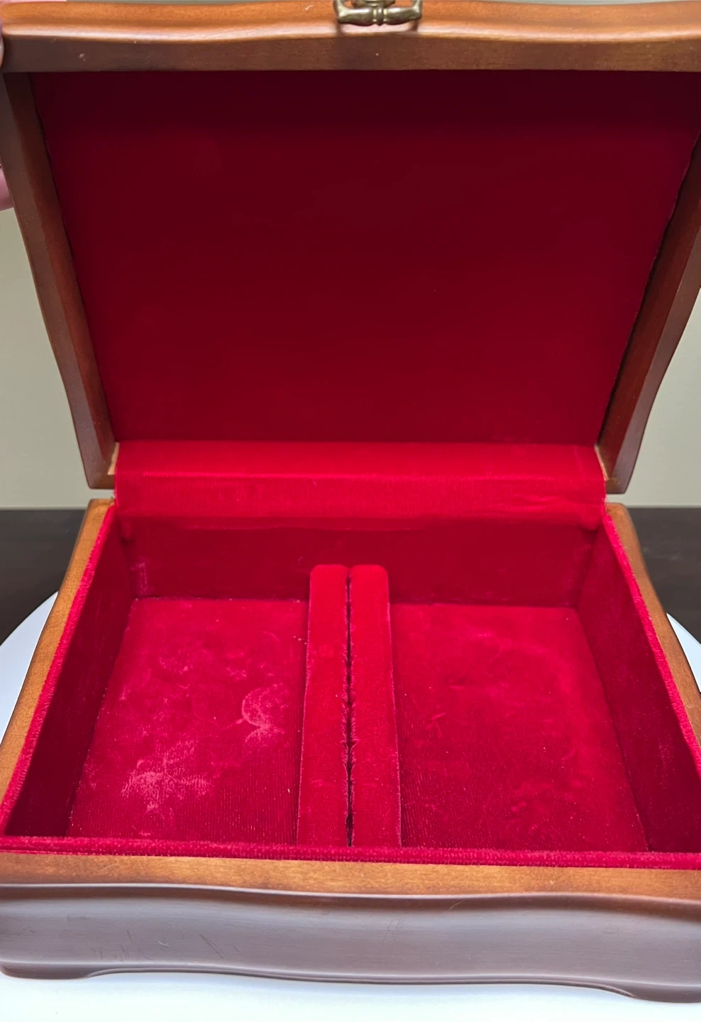 Vintage jewelry box Brass tone latch Crafted in Canada/April 26, 1982 Warm wood finish and red velvet interior Charming Great clean condition Non smoking home 9” x 7” x 3.5” Asking $15 Interested? Message me and please check my other listings…