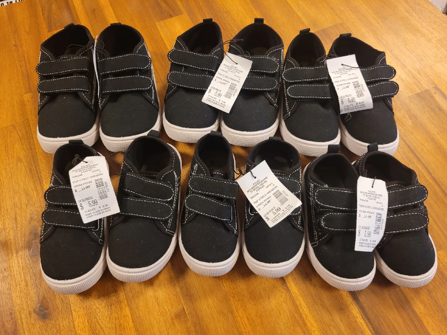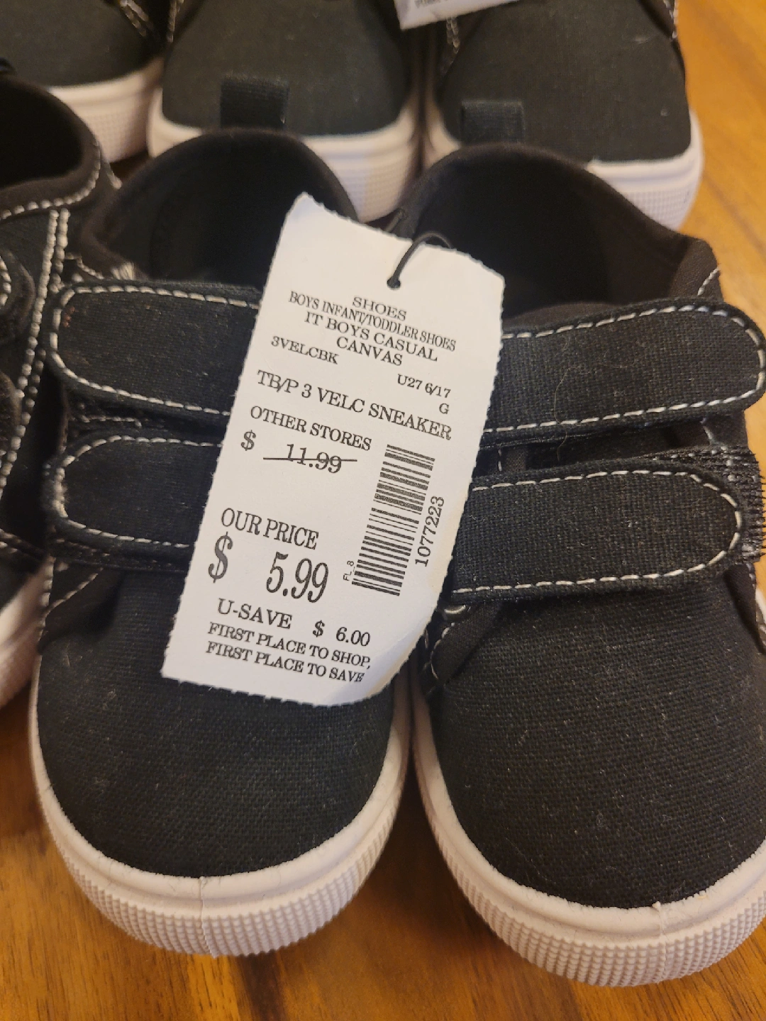 SUMMER SELL-OFF... These cute new infant/toddler shoes are black canvas sneakers with velcro straps, perfect for little ones on the go. The original price was $11.99 + tax, but you can snag them here for a steal! 6 sizes Available * 5 * 6 * 7 * 8 * 9 * 10 * Pick up in store at 258 Main Street South, Newmarket (by appointment only to guarantee we are open). *** Payable by cash, debit or credit ***