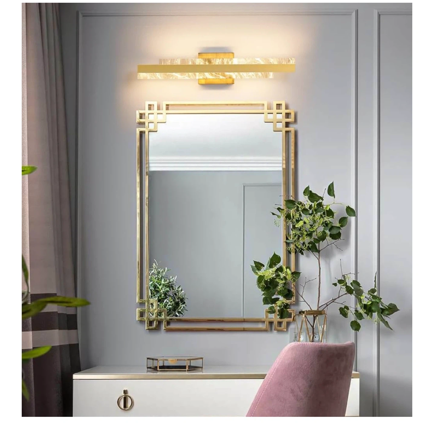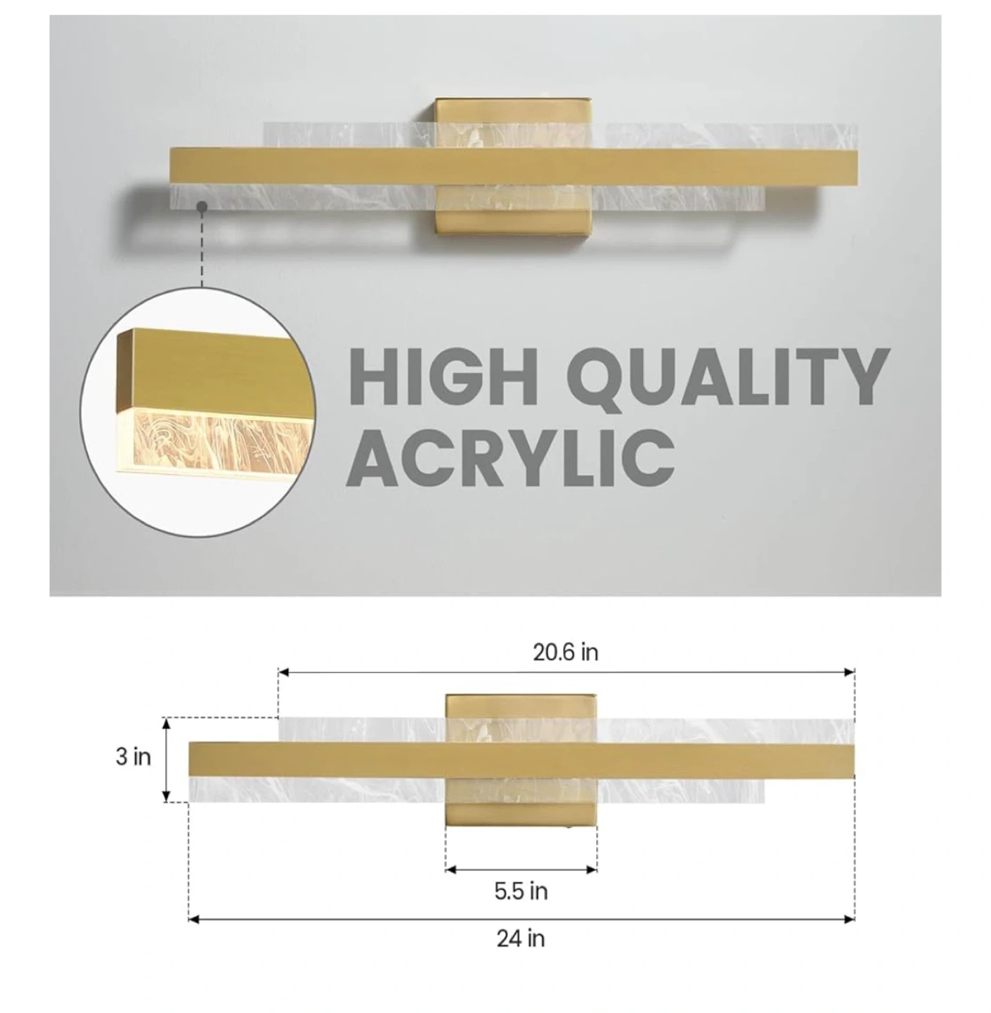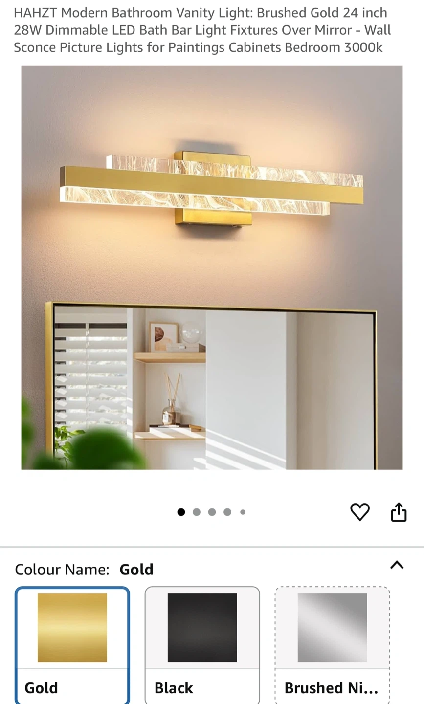 Selling a HAHZT modern bathroom vanity light in brushed gold. It's 24 inches, 28W dimmable LED bath bar light fixture, perfect over a mirror. This wall sconce picture light is suitable for paintings, cabinets, and bedrooms, with a 3000k color temperature. Made with high-quality acrylic.