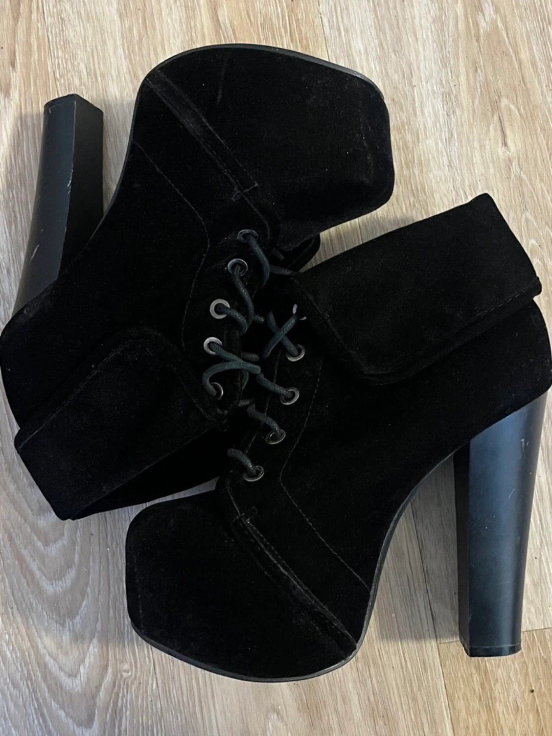 Selling a pair of black heel boots in size 7. They have a stylish design and are perfect for adding some height to your outfit. The heel measures approximately 4 inches. There are a few scuffs on the heel.