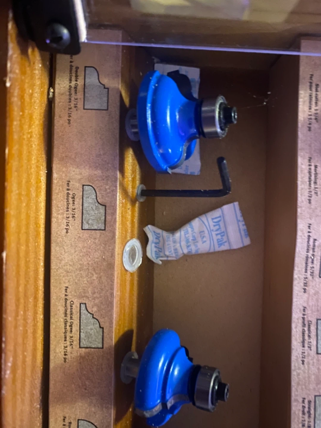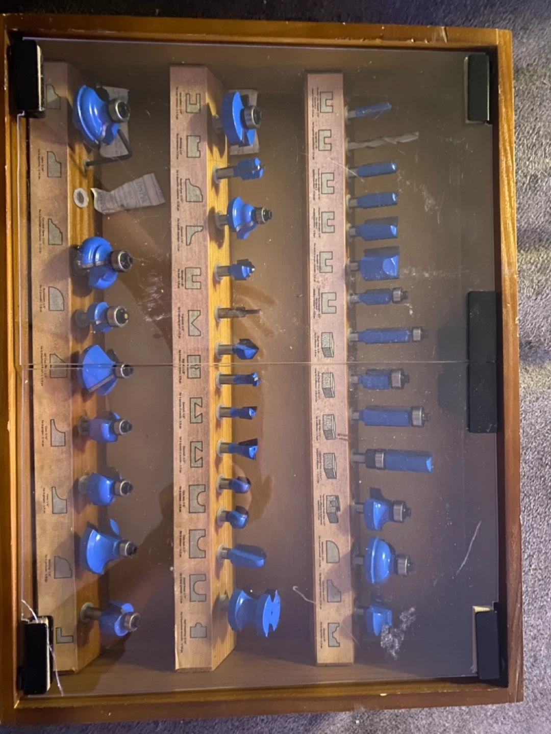 Router Bit Set with a variety of bits for different woodworking projects one missing!