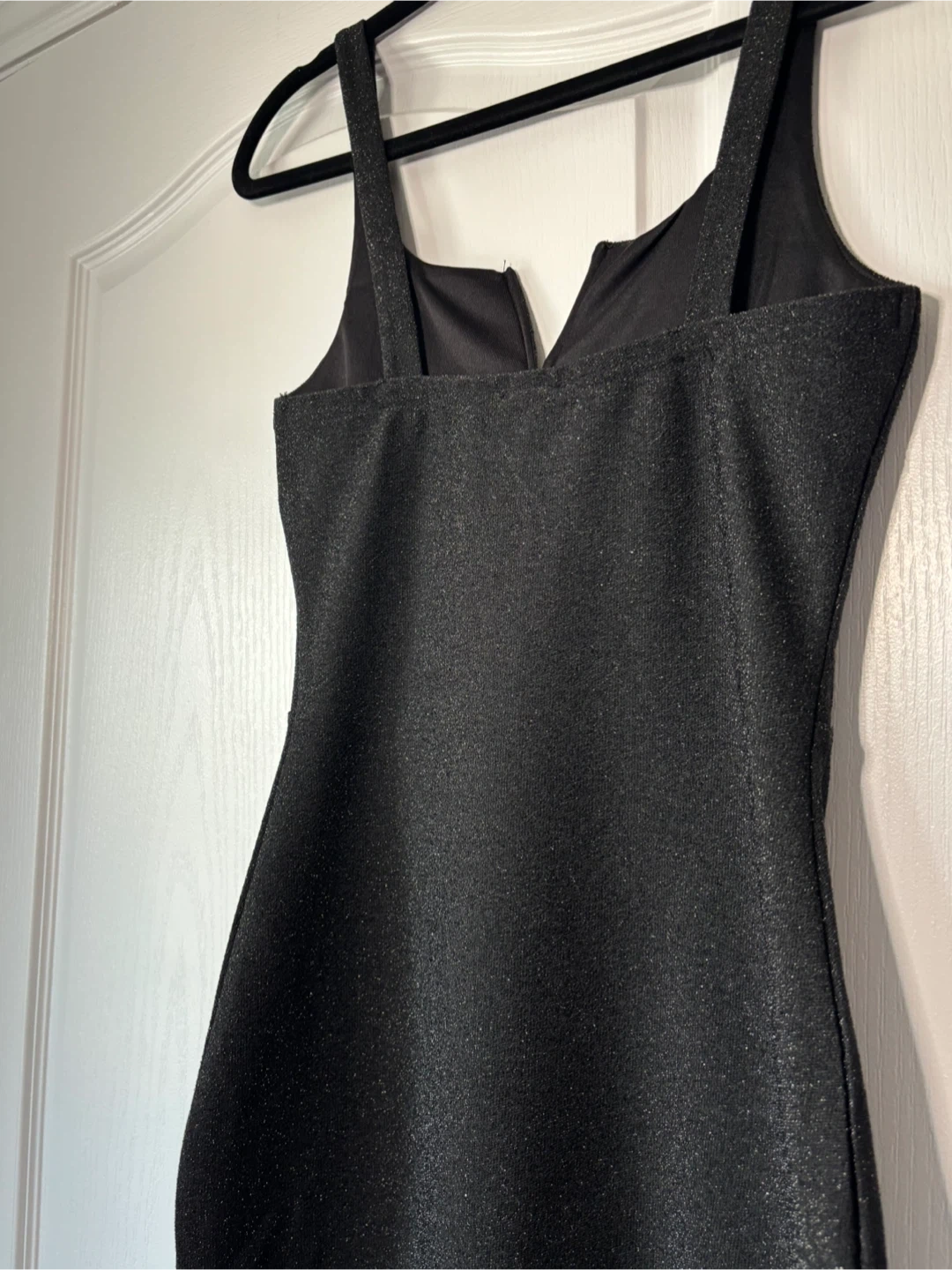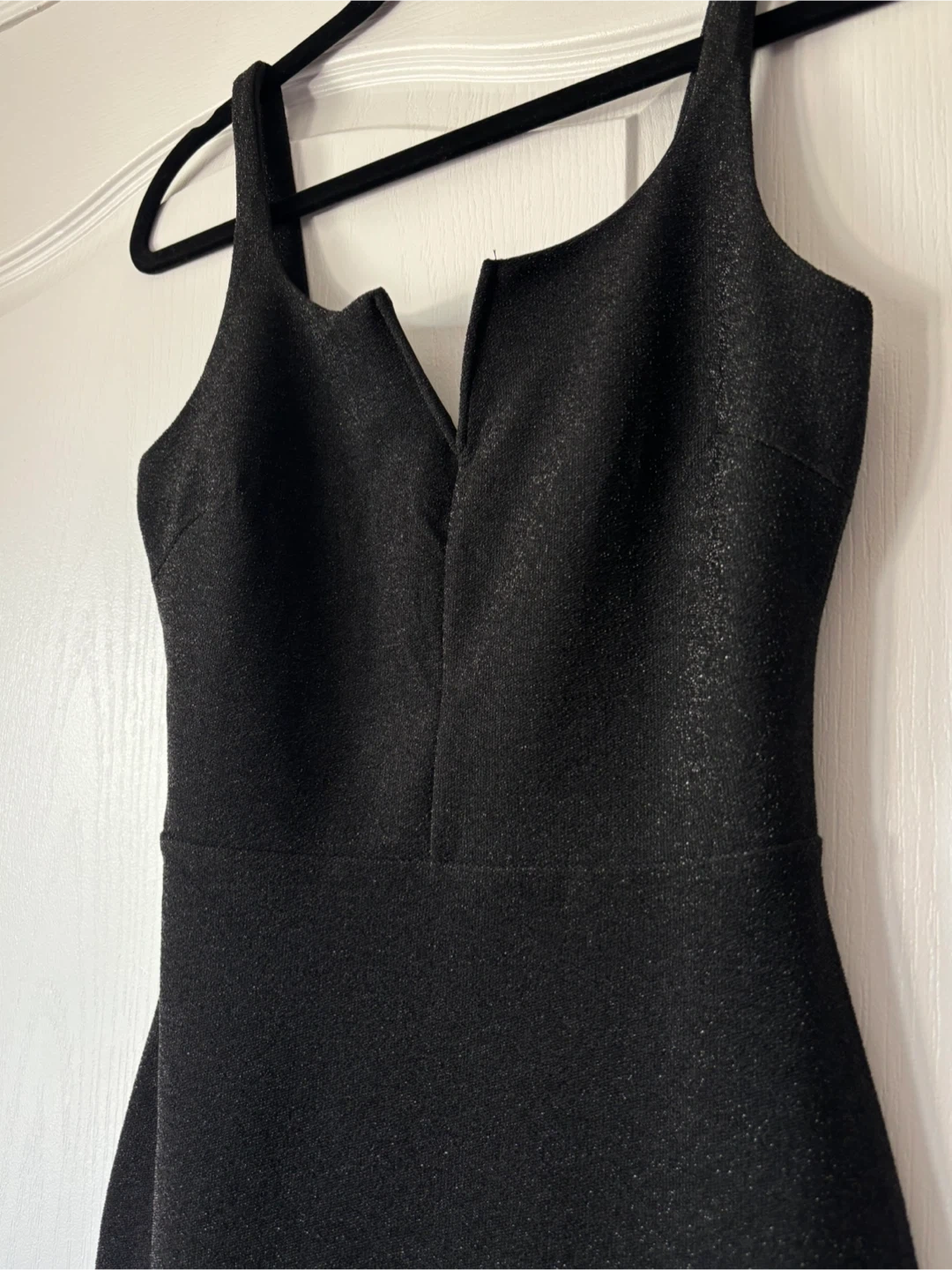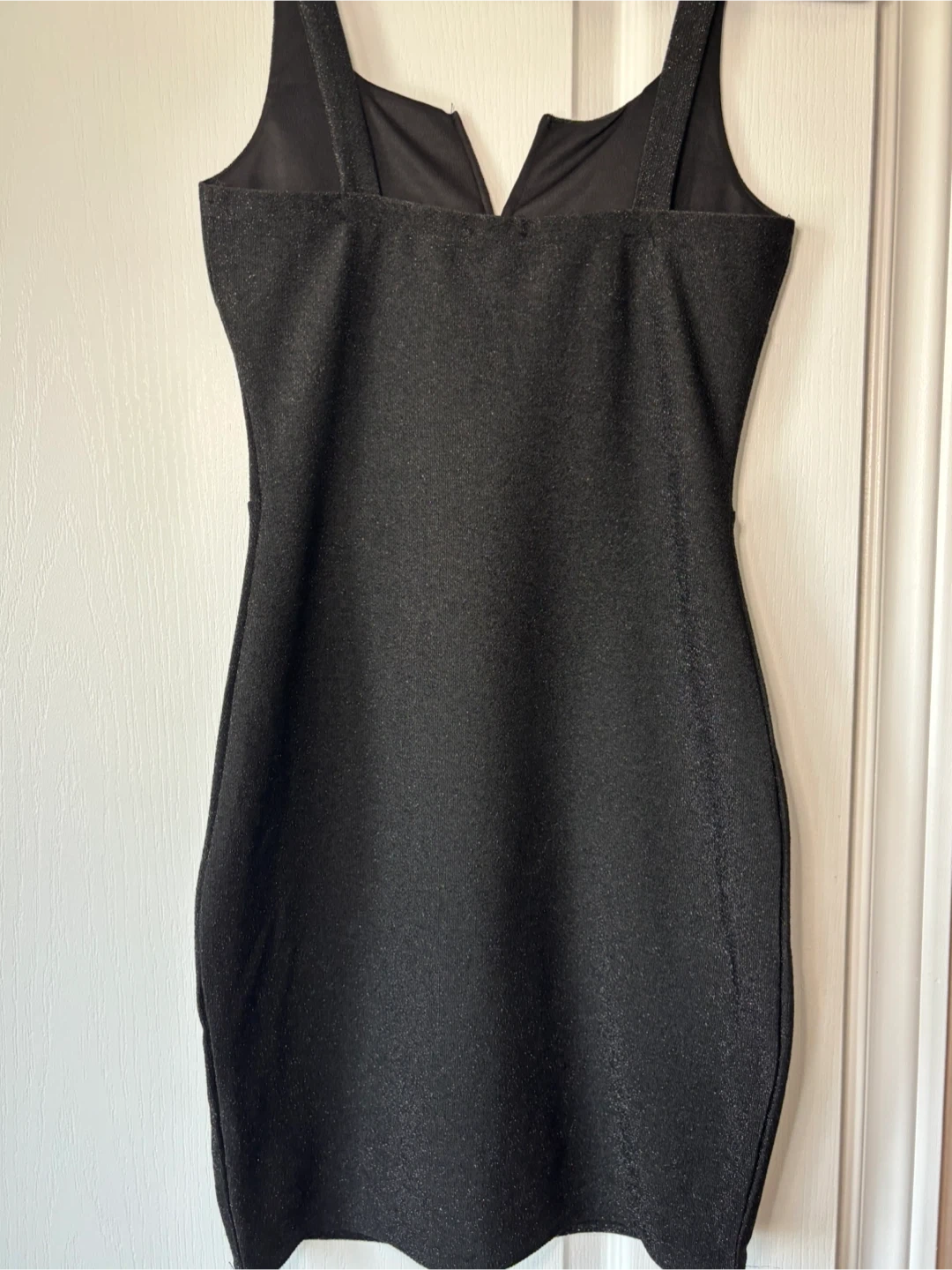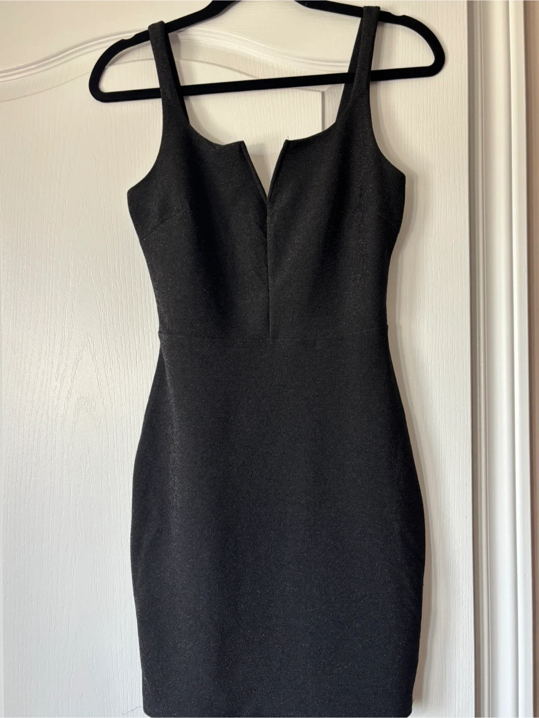 A stylish little black dress, perfect for a night out or any special occasion! It's a size small and in great condition. The dress has a unique V-neck design that adds a touch of elegance. It's a versatile piece that can be dressed up or down with the right accessories, making it a must-have for your wardrobe