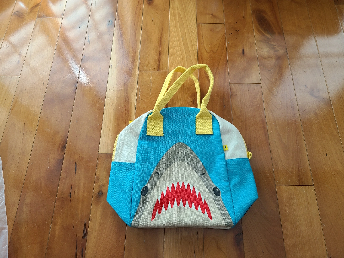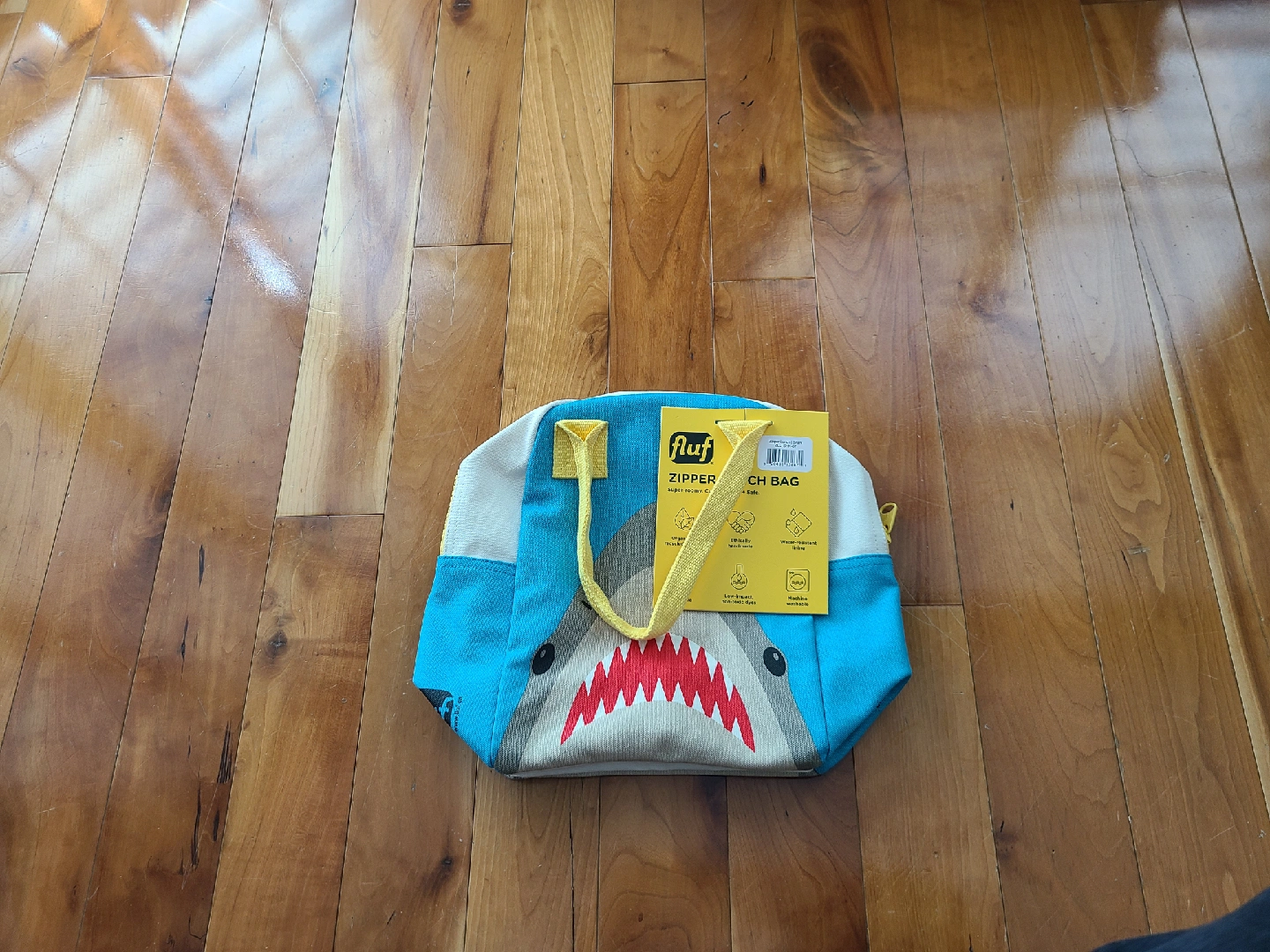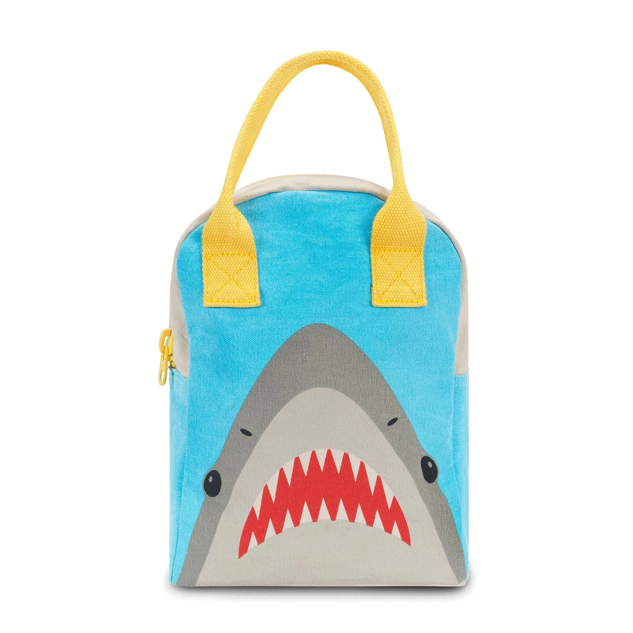 This Fluf Zipper Lunch bag features a fun shark design! It's perfect for packing lunches and snacks. - Water-resistant lining: 100% RPET (recycled water bottles) - Outer material: 100% GOTS-certified organic cotton - Machine washable and packs flat when not in use