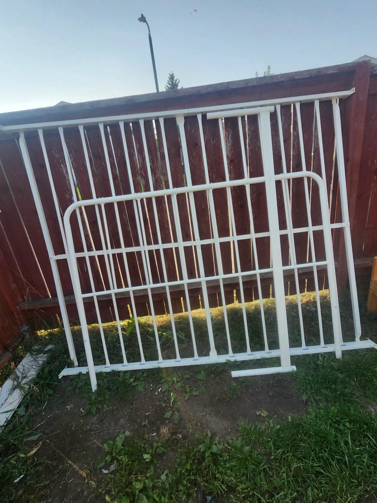 Selling a white metal bed frame. It's in good condition and ready for a new home! Perfect for a simple and clean look in your bedroom. Easy to assemble