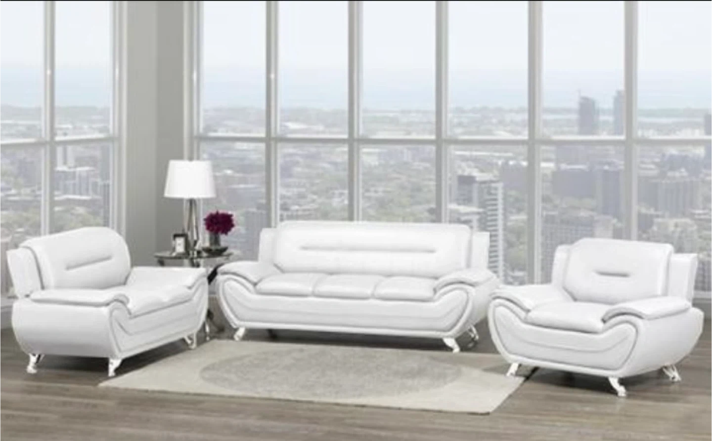 Selling a stylish white leather sofa set, which includes a three-seater sofa and two armchairs. This set would be a great addition to any living room. The sleek design and comfortable seating make it perfect for relaxing or entertaining guests