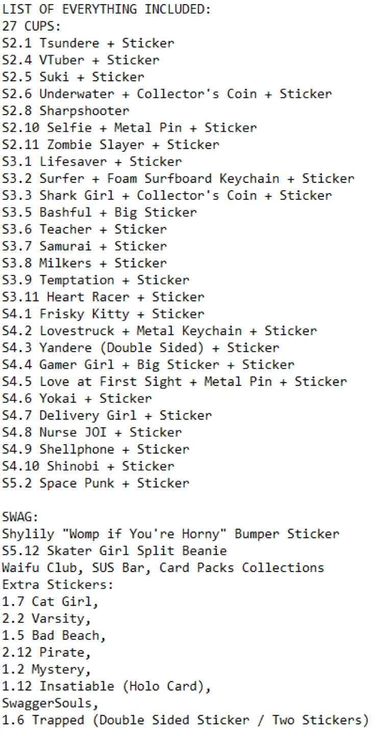 Selling my entire Gamersupps Collection. Everything included is listed here and in photo (not everything is in photos since limit is 10) Cups retail around $40 USD each new. All cups are like new, were never used for drinking only displayed on a shelf. 27 cups in total plus stickers, beanie, pins, coins, keychains. S2.1 Tsundere + Sticker S2.4 VTuber + Sticker S2.5 Suki + Sticker S2.6 Underwater + Collector's Coin + Sticker S2.8 Sharpshooter S2.10 Selfie + Metal Pin + Sticker S2.11 Zombie Slayer + Sticker S3.1 Lifesaver + Sticker S3.2 Surfer + Foam Surfboard Keychain + Sticker S3.3 Shark Girl + Collector's Coin + Sticker S3.5 Bashful + Big Sticker S3.6 Teacher + Sticker S3.7 Samurai + Sticker S3.8 Milkers + Sticker S3.9 Temptation + Sticker S3.11 Heart Racer + Sticker S4.1 Frisky Kitty + Sticker S4.2 Lovestruck + Metal Keychain + Sticker S4.3 Yandere (Double Sided) + Sticker S4.4 Gamer Girl + Big Sticker + Sticker S4.5 Love at First Sight + Metal Pin + Sticker S4.6 Yokai + Sticker S4.7 Delivery Girl + Sticker S4.8 Nurse JOI + Sticker S4.9 Shellphone + Sticker S4.10 Shinobi + Sticker S5.2 Space Punk + Sticker S4.10 Shinobi + Sticker S5.2 Space Punk + Sticker Shylily "Womp if You're Horny" Bumper Sticker S5.12 Skater Girl Split Beanie Waifu Club, SUS Bar, Card Packs Collections Extra Stickers: - 1.7 Cat Girl - 2.2 Varsity - 1.5 Bad Beach - 2.12 Pirate - 1.2 Mystery - 1.12 Insatiable (Holo Card) - SwaggerSouls - 1.6 Trapped (Double Sided Sticker / Two Stickers)