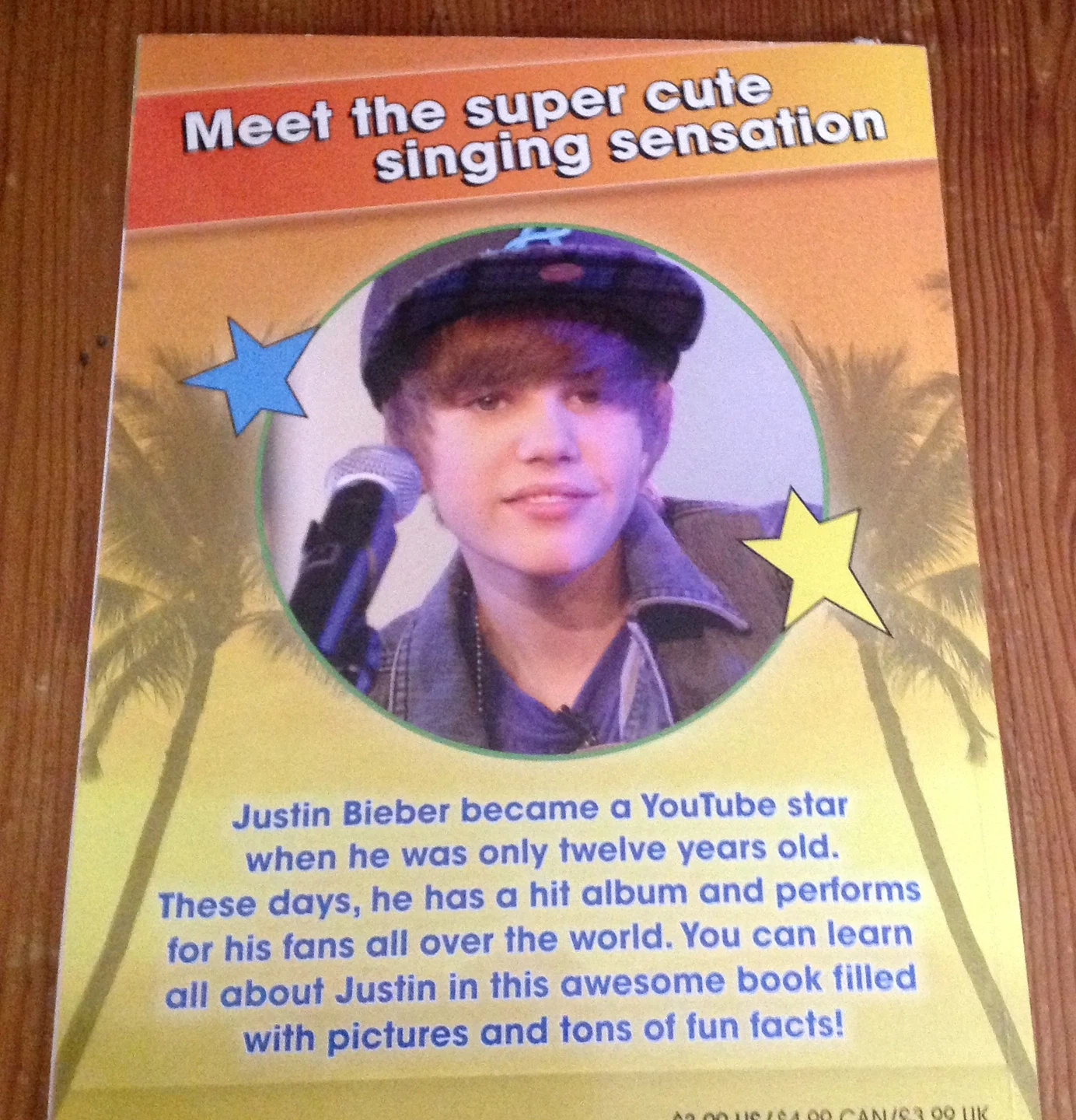 Selling the book Justin Bieber: His World by Riley Brooks! It's a biography about Justin's rise to fame. You can learn all about Justin in this awesome book filled with pictures and tons of fun facts. Unusual Bieber book, early age.