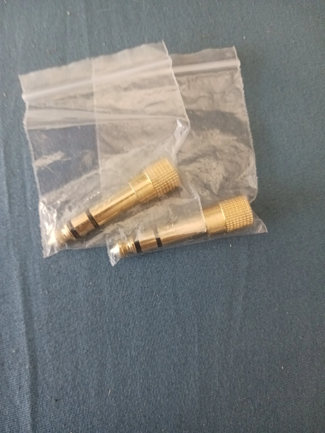 Selling two audio jack adapters in gold colour. They are still sealed in their plastic packaging. Sold on Amazon for $7.99. Items sold per.