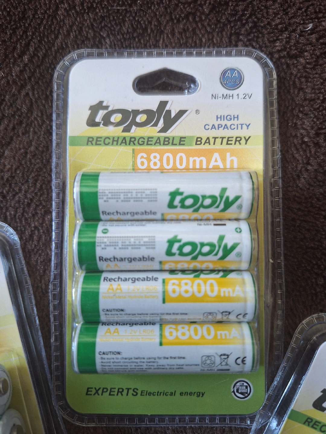 I'm selling brand new Toply AA rechargeable batteries. These are high capacity 6800mAh batteries, perfect for various electronic devices. They are Ni-MH 1.2V and come in a pack of four. $20 per package or 4 for $70 π 4 and 8 slot chargers also available π