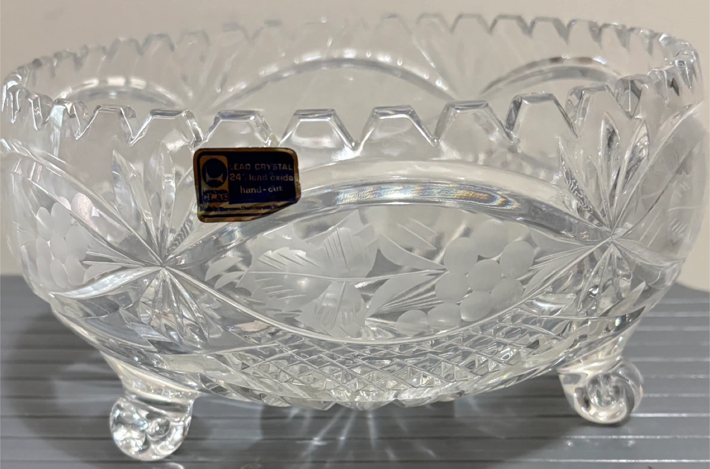 Lausiter hand-cut 24% lead crystal bowl! It features a delicate floral design and sits on three small feet. In excellent condition 8 inch diameter and 4.5 inches high