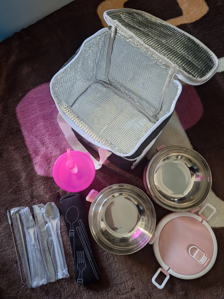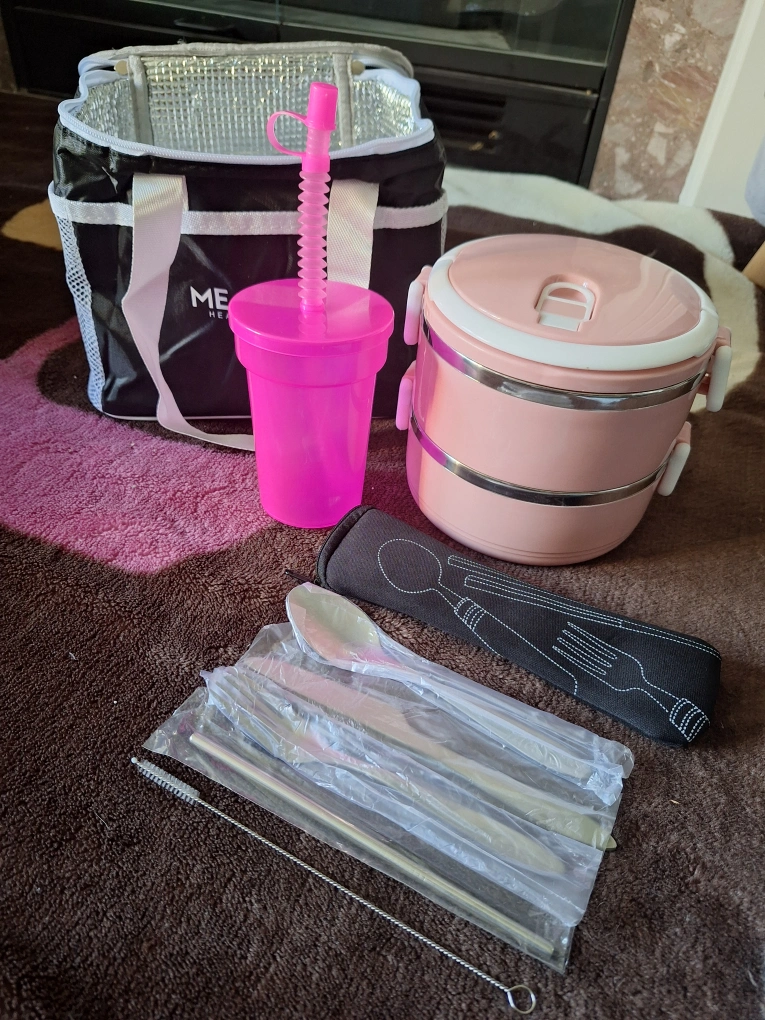 Meal Hero lunch box set includes a black and white insulated lunch bag, a pink two-tiered lunch container, a pink cup with a straw, and a cutlery set with a carrying case. Perfect for taking lunch on the go! And still some room to for a couple granola bars or something. π Everything you could possibly need.
