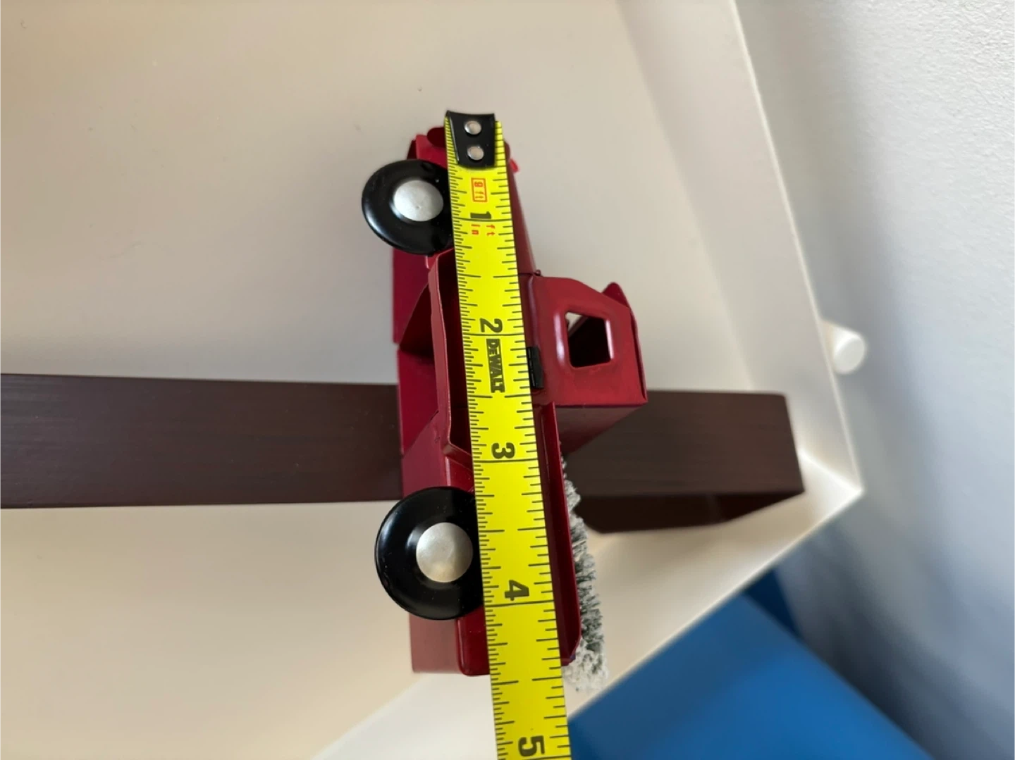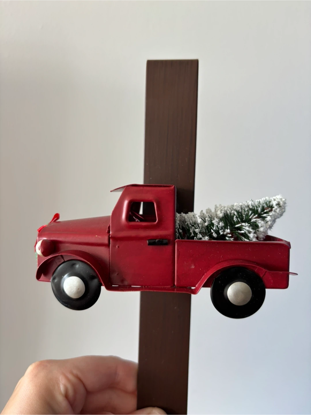 Cute red truck Christmas wreath hanger! It's in great shape and ready to hold your festive wreaths. The truck is about 4 inches long, and the whole hanger is around 15 inches long. Add a touch of vintage charm to your holiday decor