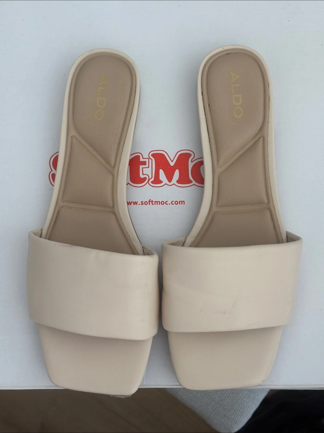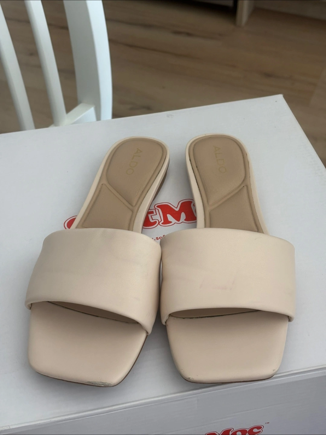Cute cream-coloured ALDO slides, perfect for summer! They're a size 8 and in great condition. They would look great with any outfit!