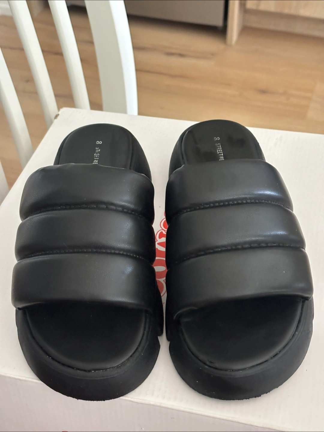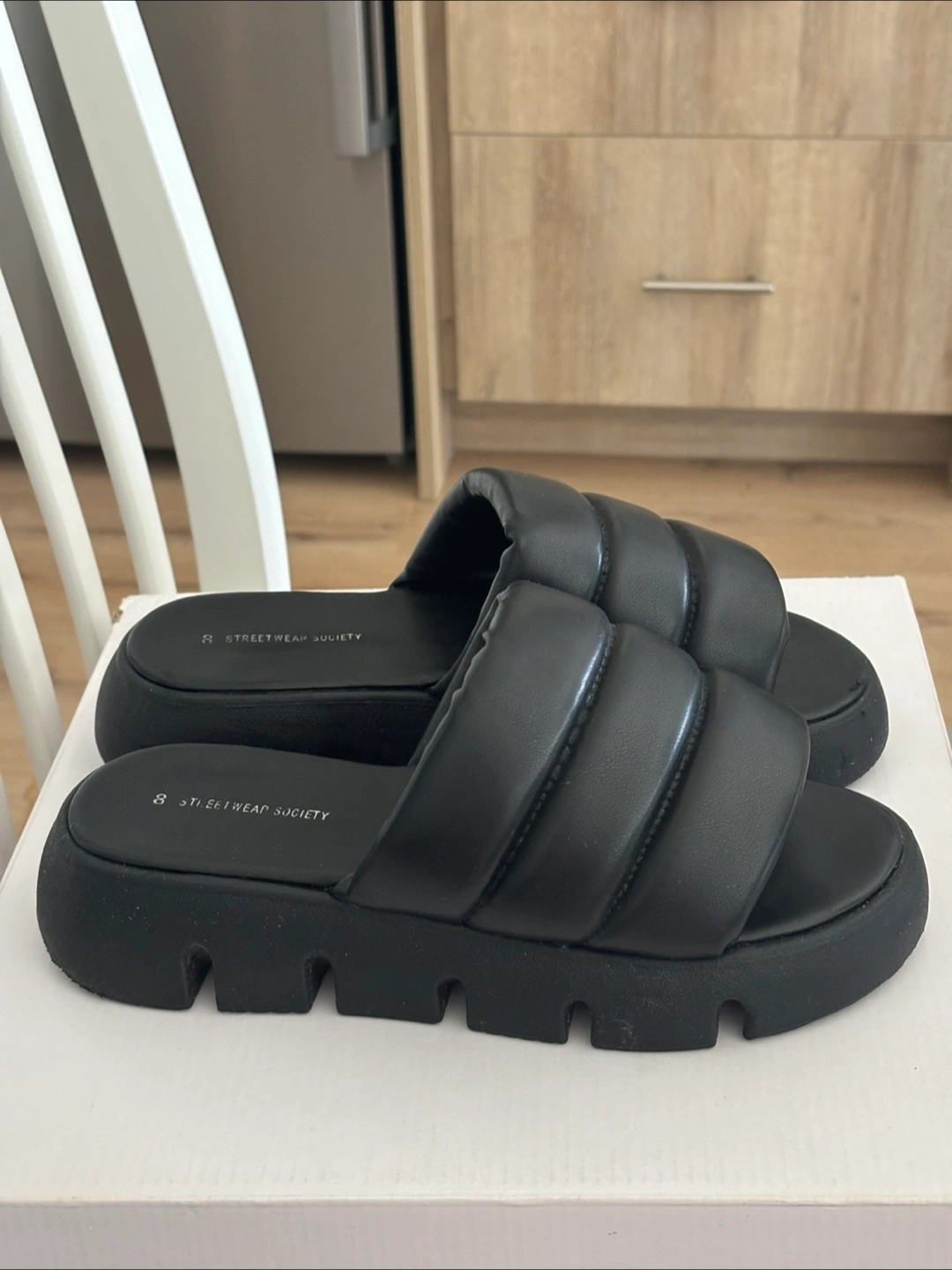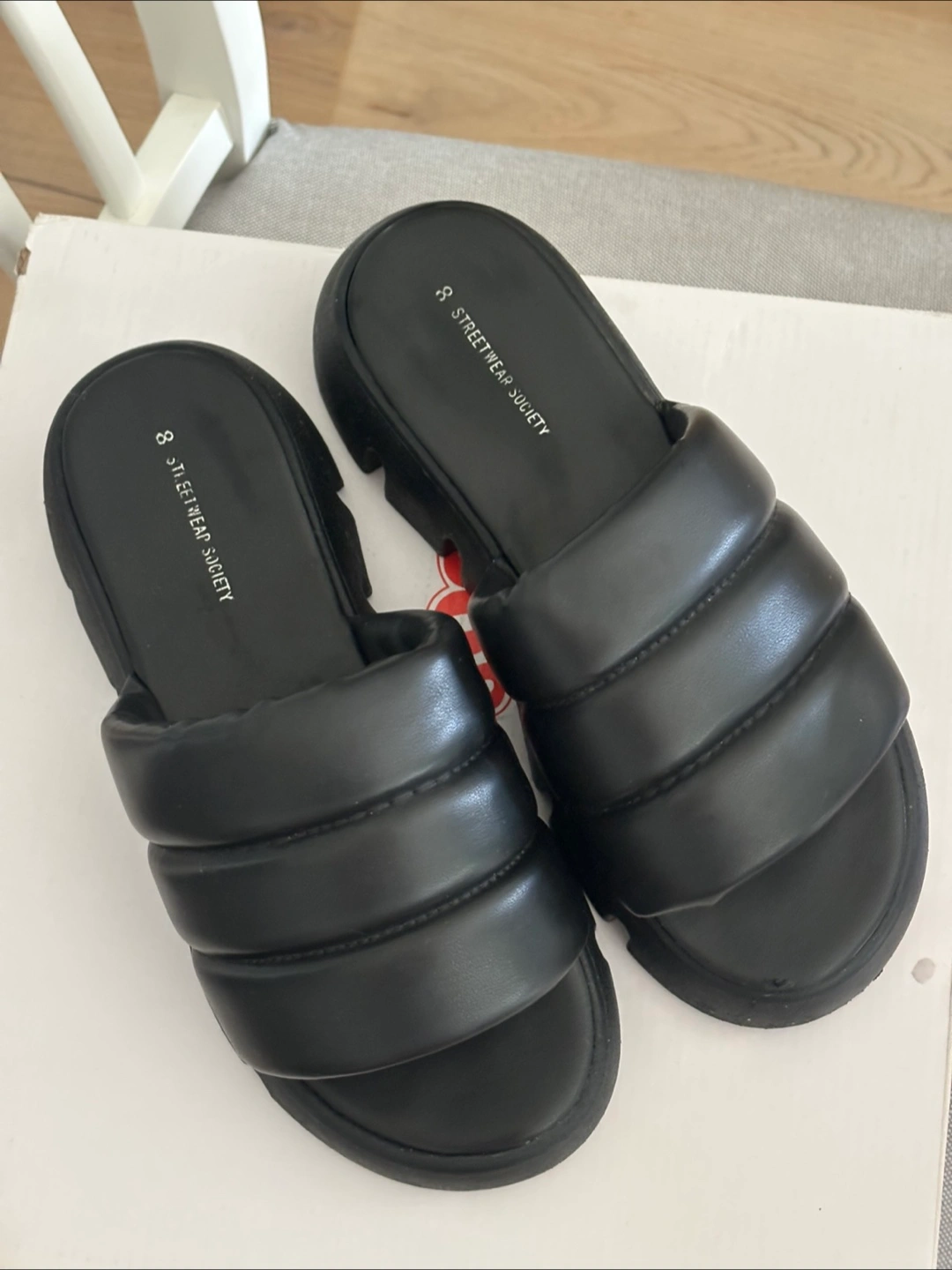 Comfy and stylish black padded slides from Streetwear Society in size 8. These are perfect for everyday wear!