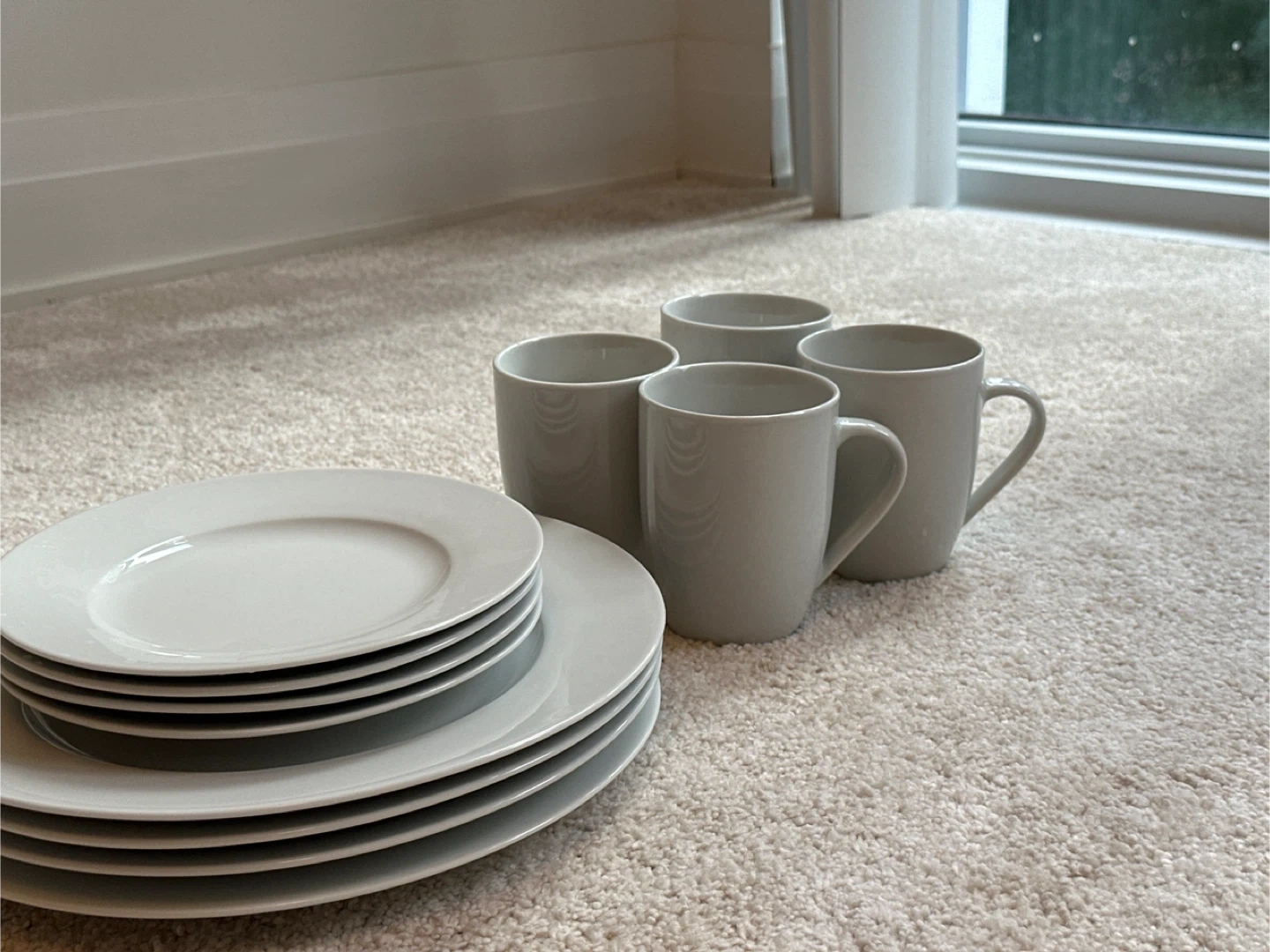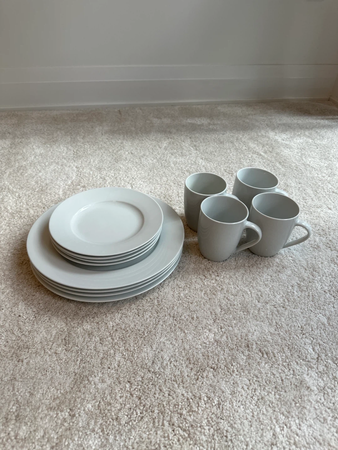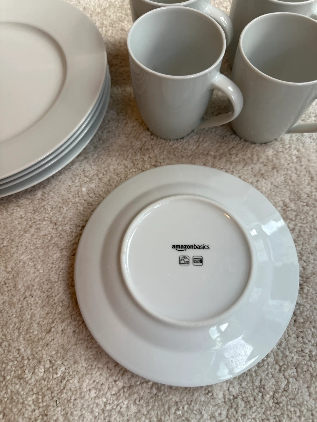 Selling a set of white plates and mugs from AmazonBasics. Includes plates and four mugs! They're in great condition and ready for a new home